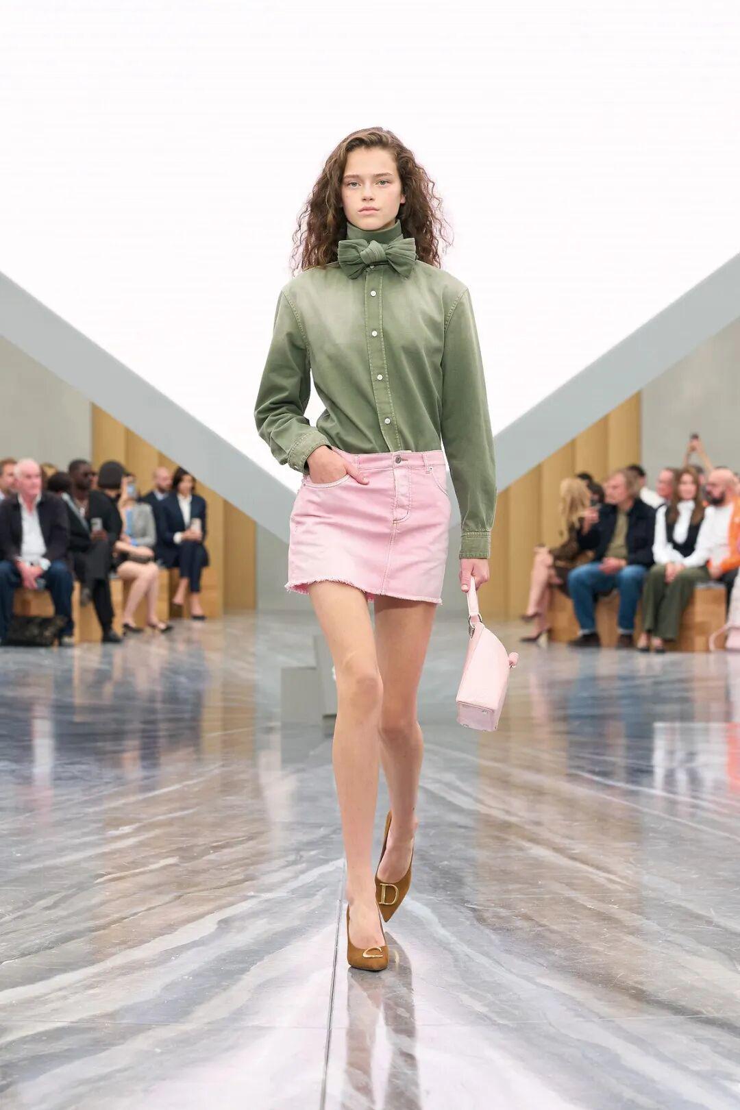 Dior的渐变绿衬衫+樱花粉短裙和包包,像春天里的马克龙,很清新。▼
