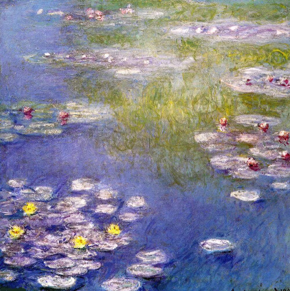 莫奈的油画睡莲也有一抹紫+黄。▼