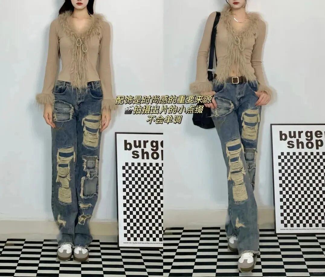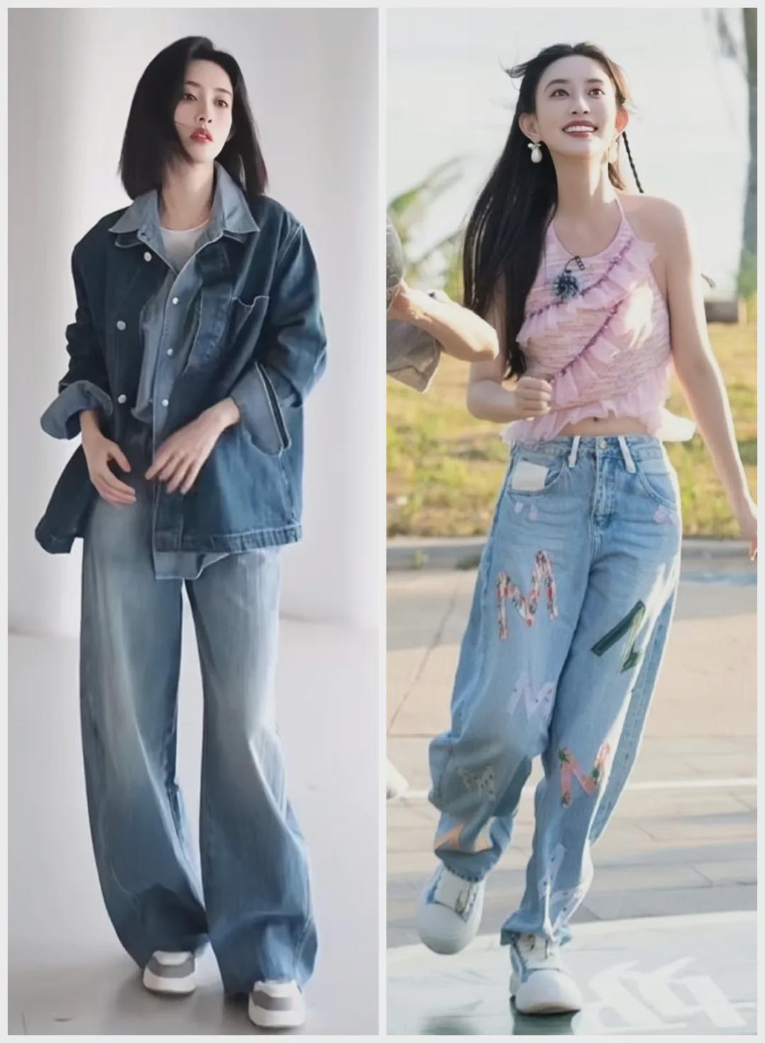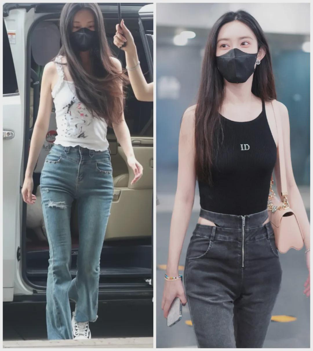 这种“宽窄宽”的裤型,会加倍暴露她腰胯不流畅、胯部低宽的问题,直接把身材短板焊死在闪光灯下。