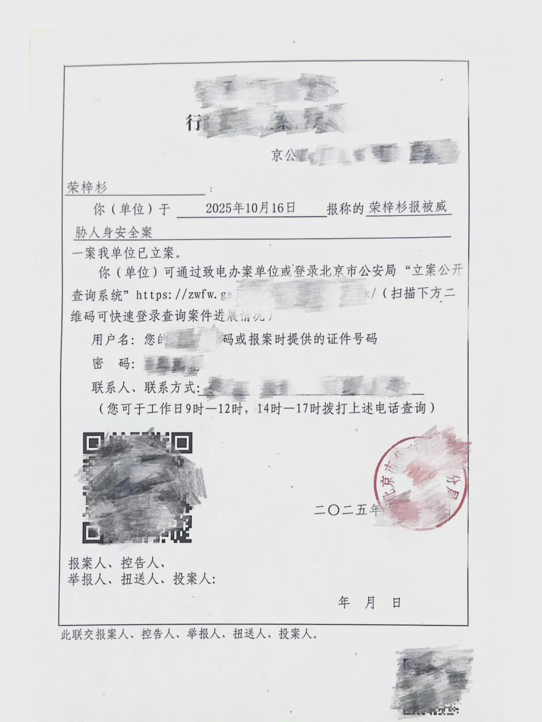 荣梓杉工作室晒出报案回执,并表示目前已就上述骚扰、威胁、侵犯隐私、恶意造谣等行为,全面搜集证据,并正式启动法律程序,坚决追究相关人员的法律责任。