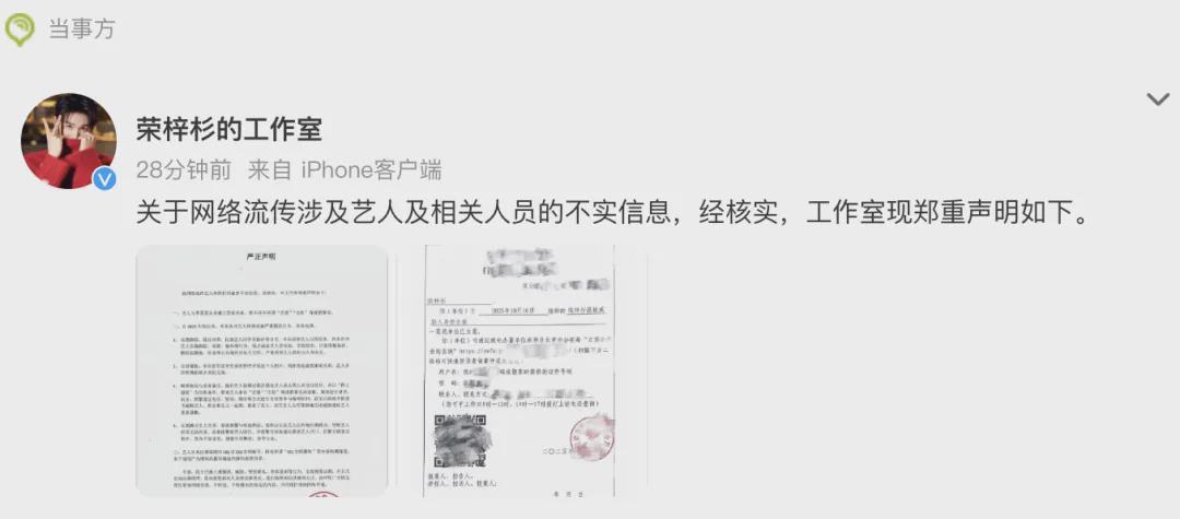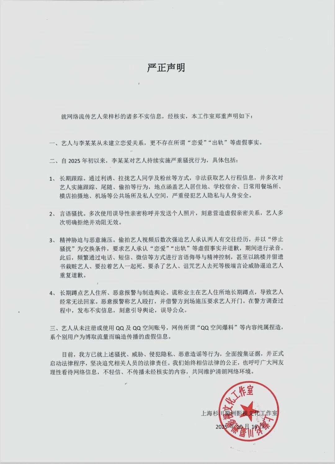 今天(10月16日)上午10时31分,荣梓杉工作室发声明: