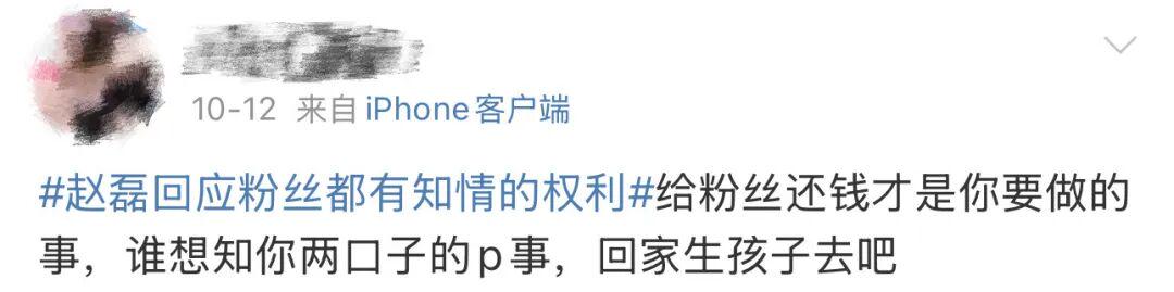 评论区成了大型讨债现场,“还钱”、“偶像失格”的呐喊此起彼伏;运营整整7年的粉丝大站连夜改名“赵磊今天离婚了吗”,每个字都透着心碎;就连偶尔上个热搜,广场上也是骂声一片。