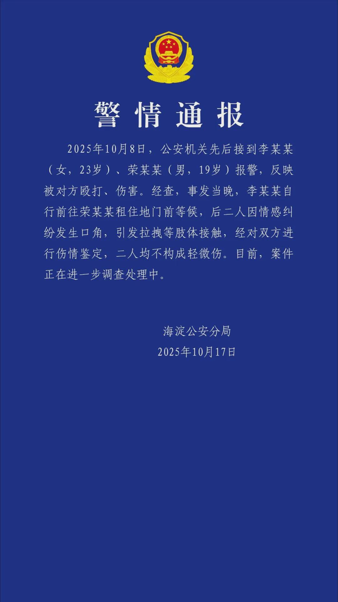 2025年10月8日,公安机关先后接到李某某(女,23岁)、荣某某(男,19岁)报警,反映被对方殴打、伤害。