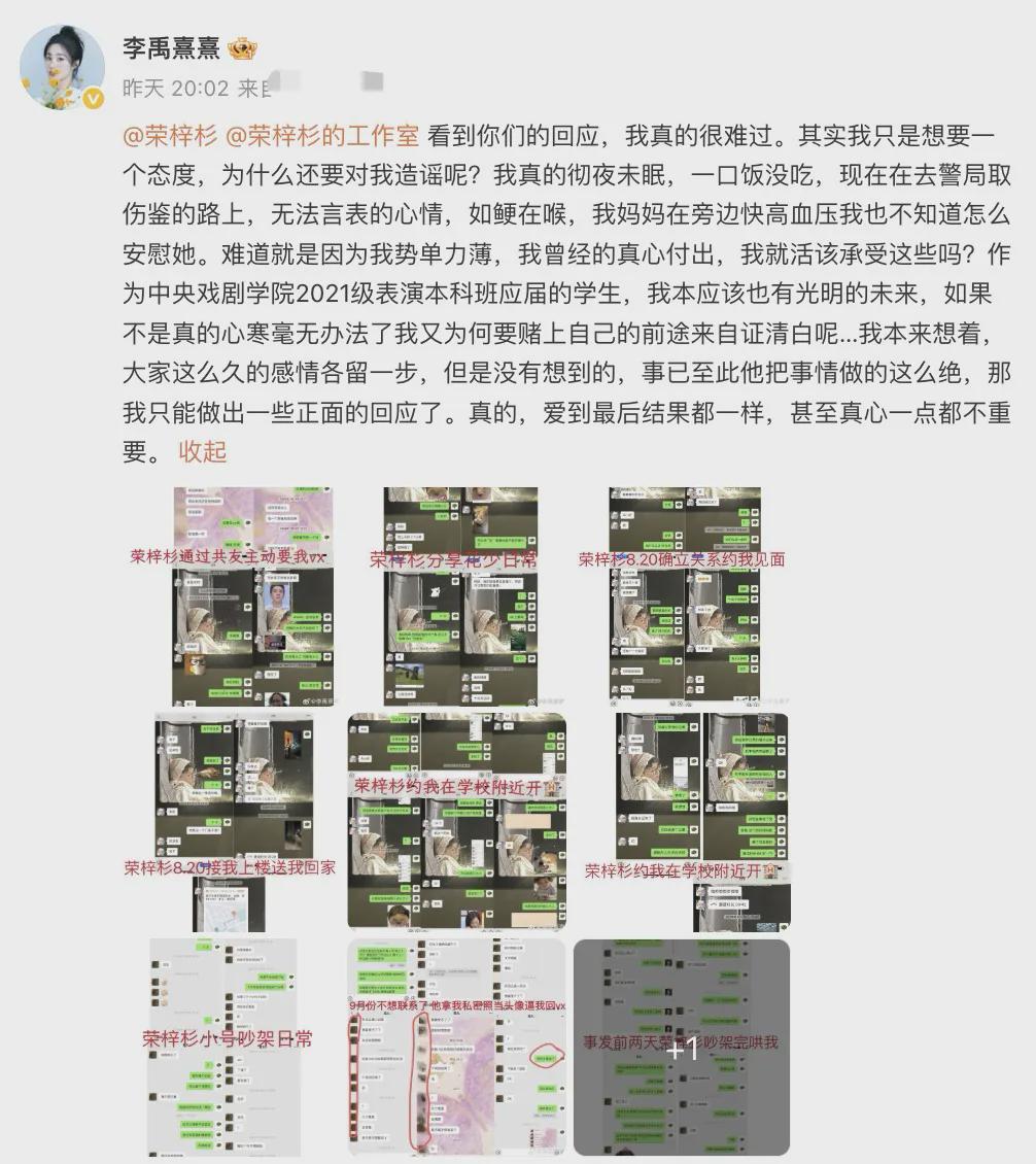 当晚,演员李禹熹再次发文回应,称荣梓杉方造谣,并放出两人恋爱聊天记录。