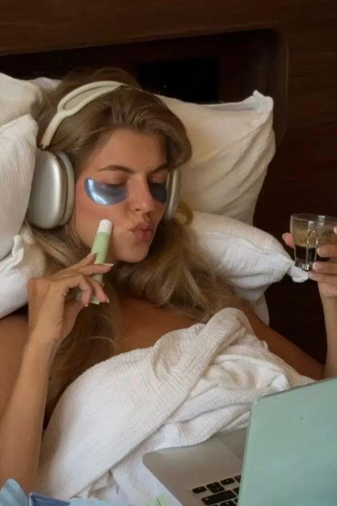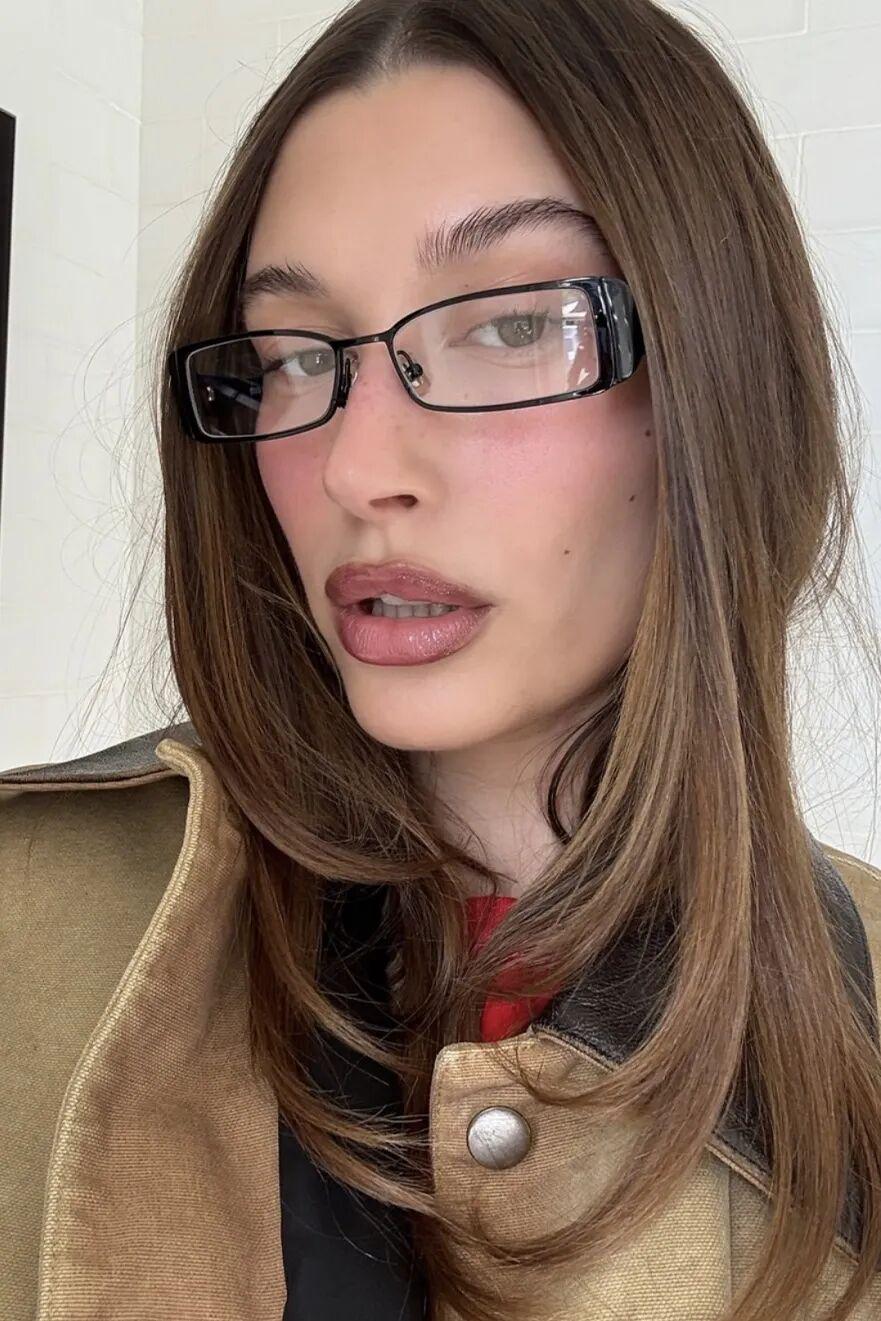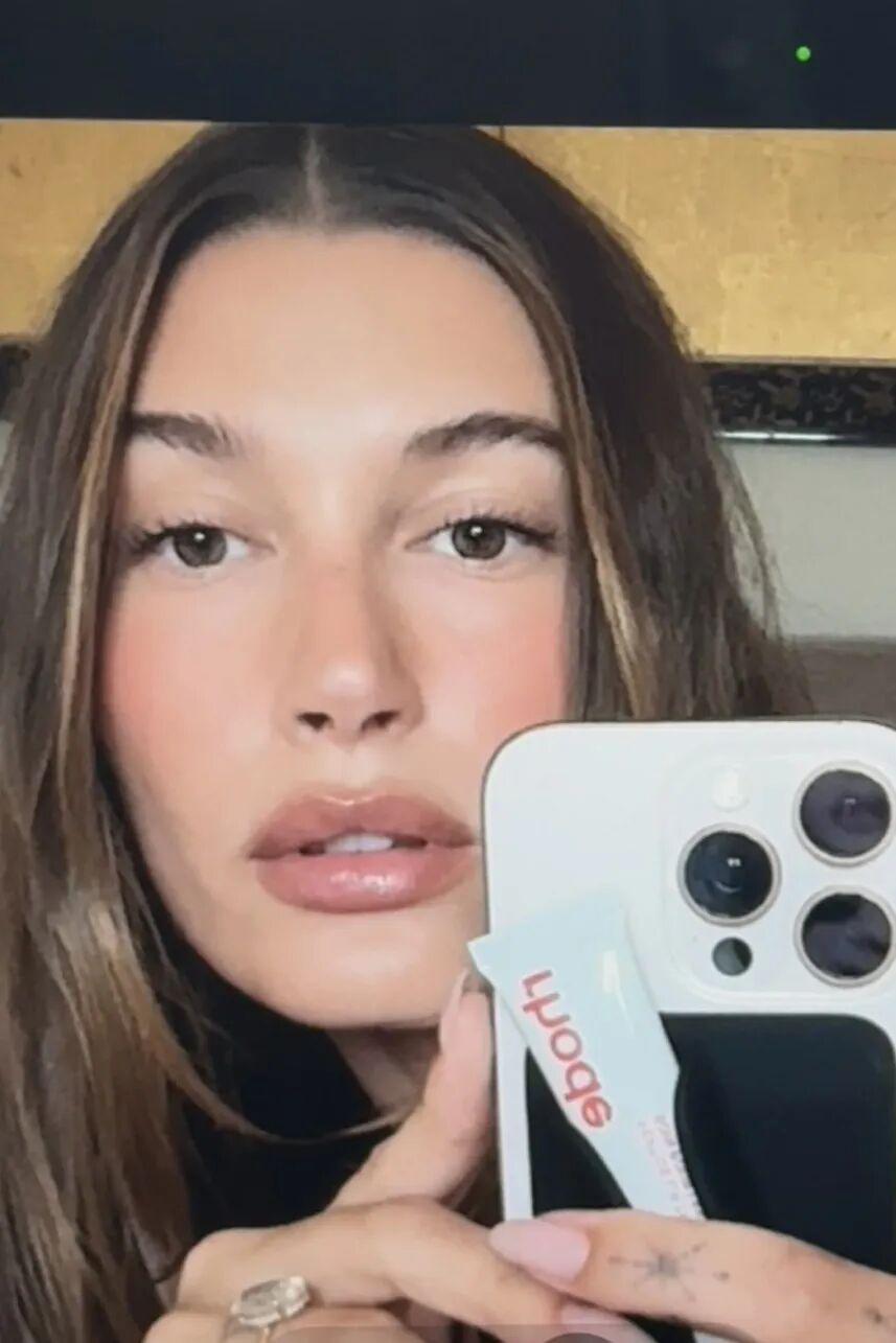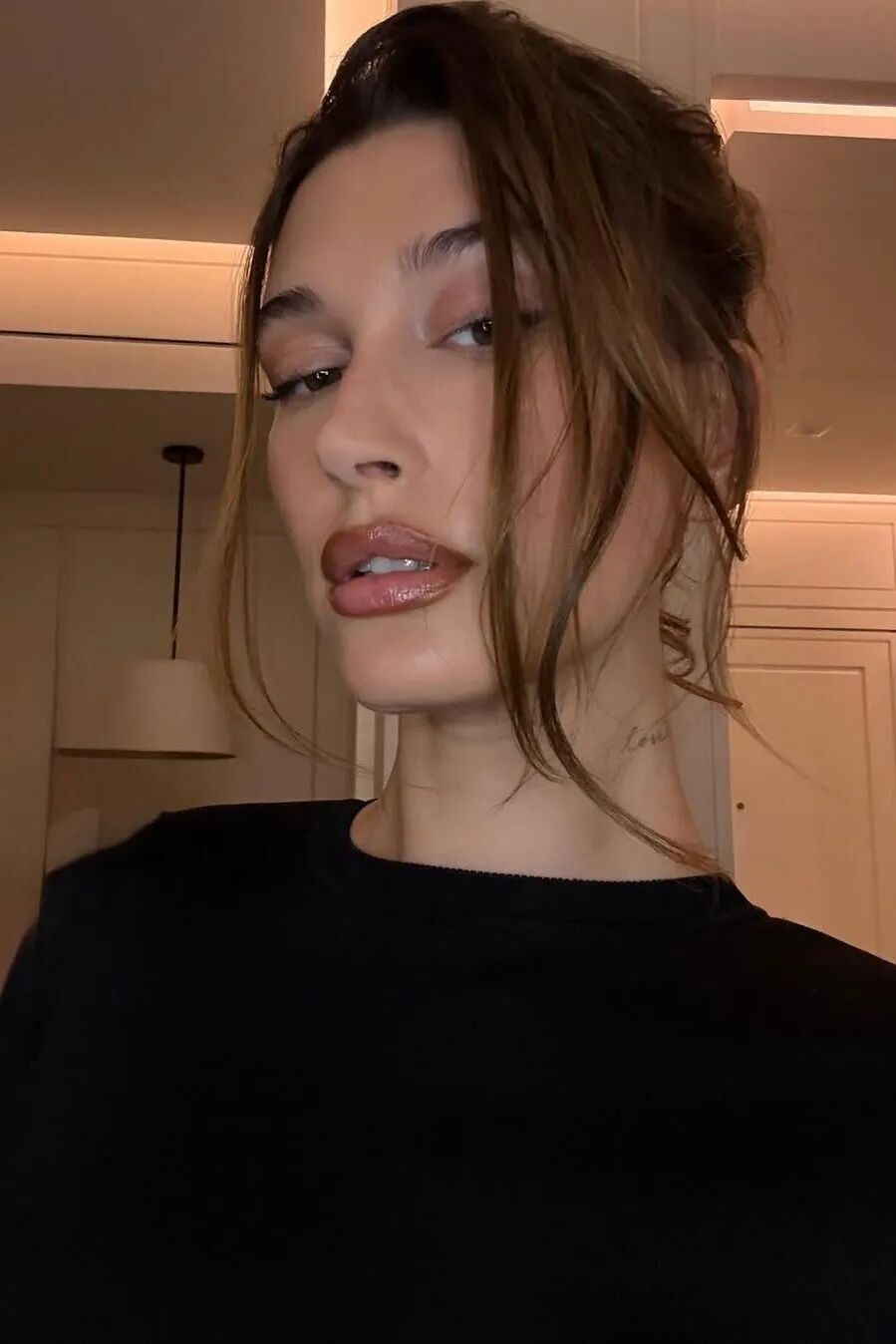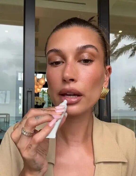 Hailey 的“奶油拿铁唇”妆容已经成了这两年的风向标。她不再追求夸张的唇色,而是通过细节塑造气场。略深一度的棕调唇线轻轻描在唇缘,让唇形看起来更立体。唇中央叠加浅粉或米杏色唇蜜,带出自然光泽,让双唇在柔光中显得更饱满。