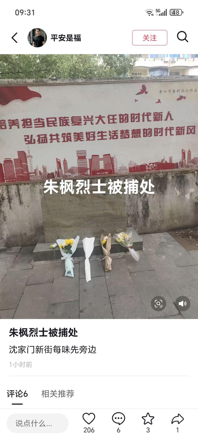 朱枫烈士被捕处有人送鲜花。网页截图