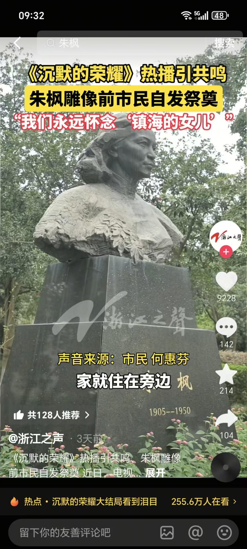 据浙江之声,近日,《沉默的荣耀》在央视热播,剧中的红色女特工,就是出生于宁波镇海的朱枫。这两天,在朱枫的家乡镇海,一些市民自发来到纪念烈士的公园——枫园(当地老百姓也称朱枫公园),向烈士雕像献花致敬。有市民表示,朱枫是镇海的女儿,永远怀念她。