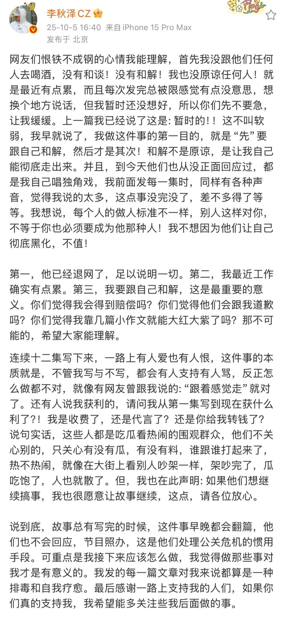 “第一,他已经退网了,足以说明一切。第二,我最近工作确实有点累。第三,我要跟自己和解,这是最重要的意义。你们觉得我会得到赔偿吗?你们觉得他们会跟我道歉吗?你们觉得我靠几篇小作文就能大红大紫了吗?那不可能的,希望大家能理解”