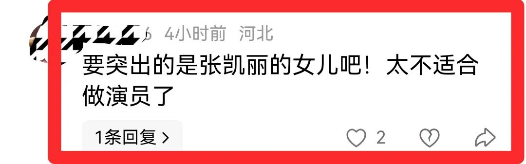 有网友直言,“要突出的是张凯丽的女儿吧!太不适合做演员了”。