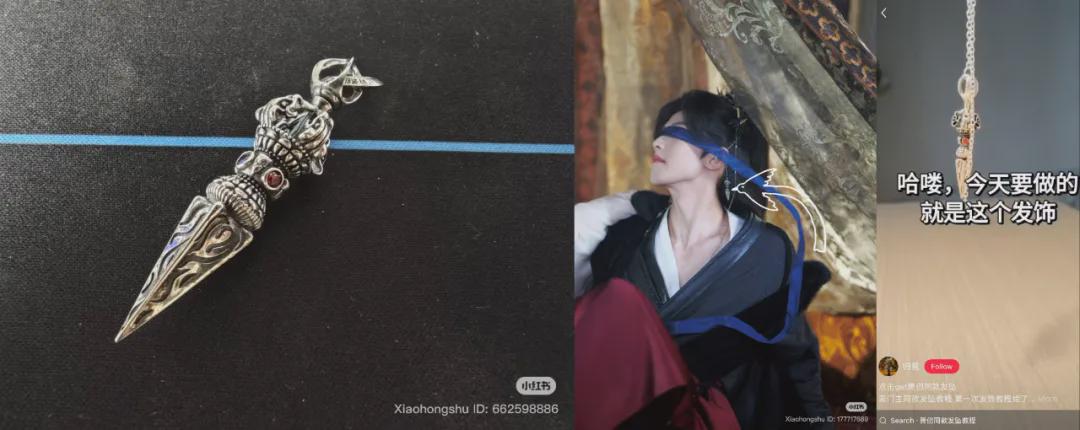 先来插一句题外话,仅萧仞耳后垂着的发饰坠子这一“神来之笔”,已在社交媒体平台上延伸出“上链接,求同款”“制作教程”“佩戴教程”等格式讨论,甚至有网友“理讨”改为耳饰是否会失去神韵,认真的劲头更见真心。