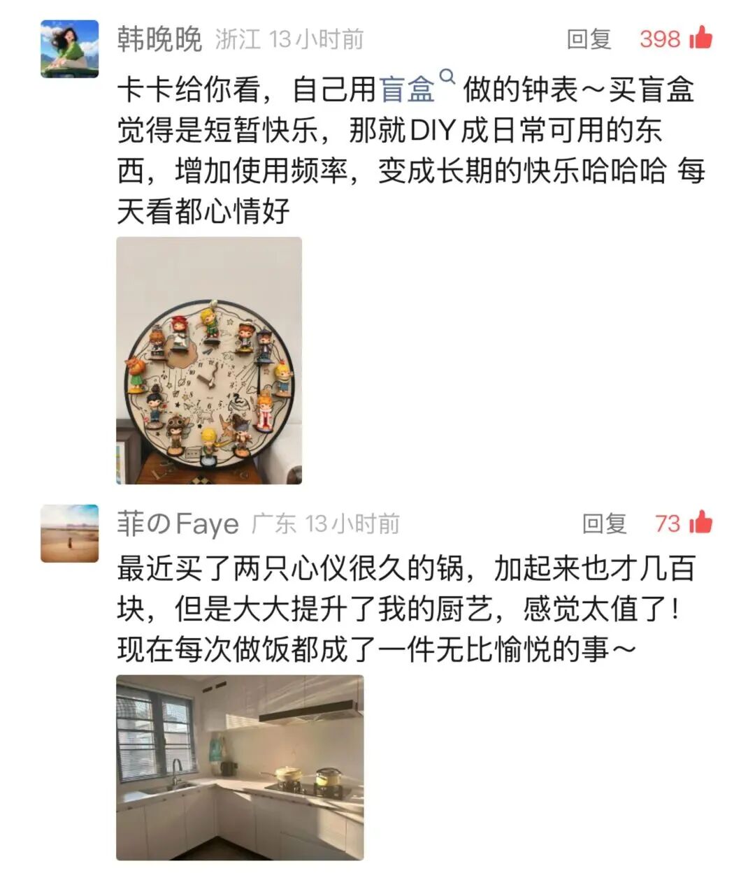 比如,有读者把喜欢的盲盒diy成日常利用率很高的物品,让短暂的快乐延续成了每一天的小确幸;也有读者买了能提升做饭幸福感的锅具,让下厨从任务变成享受。▼