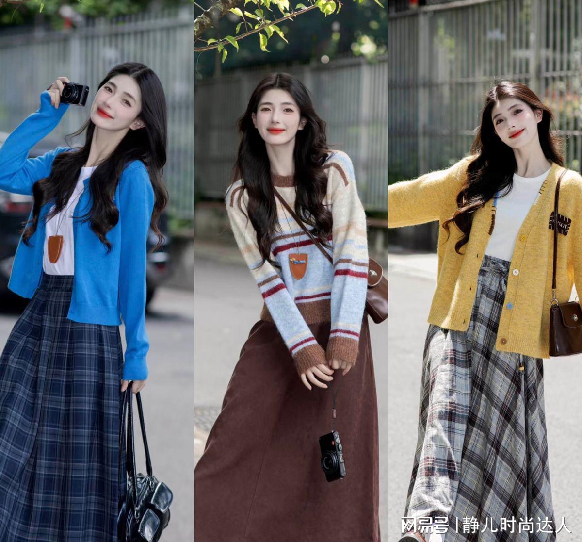 无论是蓝色的开衫,还是黄色的开衫,都可以结合白色T恤,最后在下半身匹配一条格纹半身裙,很有文艺的气息。