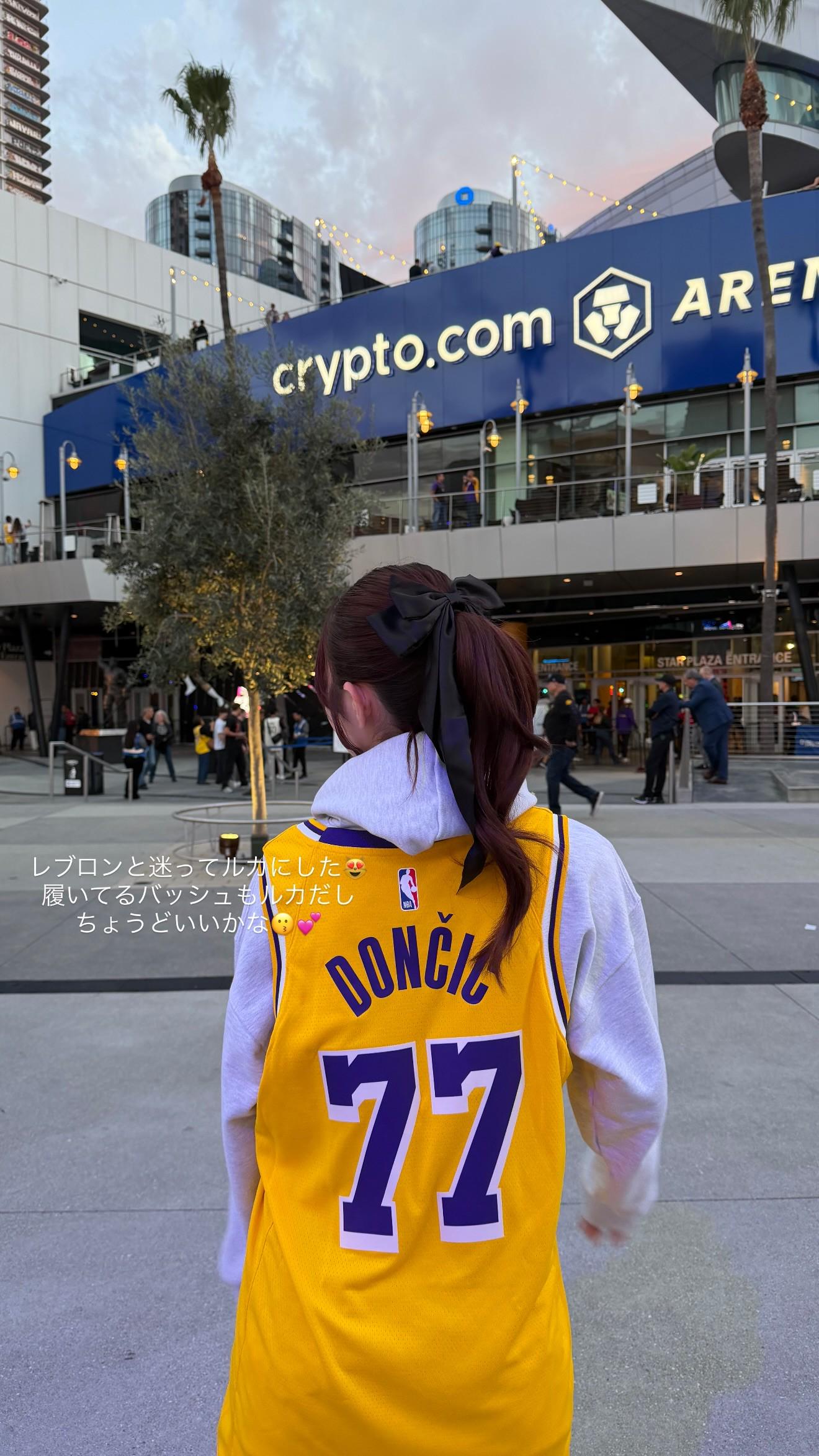 本场比赛,日本著名艺术女星葵伊吹来到斯台普斯中心观看湖勇大战,她在社媒分享了多张图片,通过图片可以看到,葵伊吹身着东契奇77号球衣,坐在观众席最前排,紧挨湖人替补席。