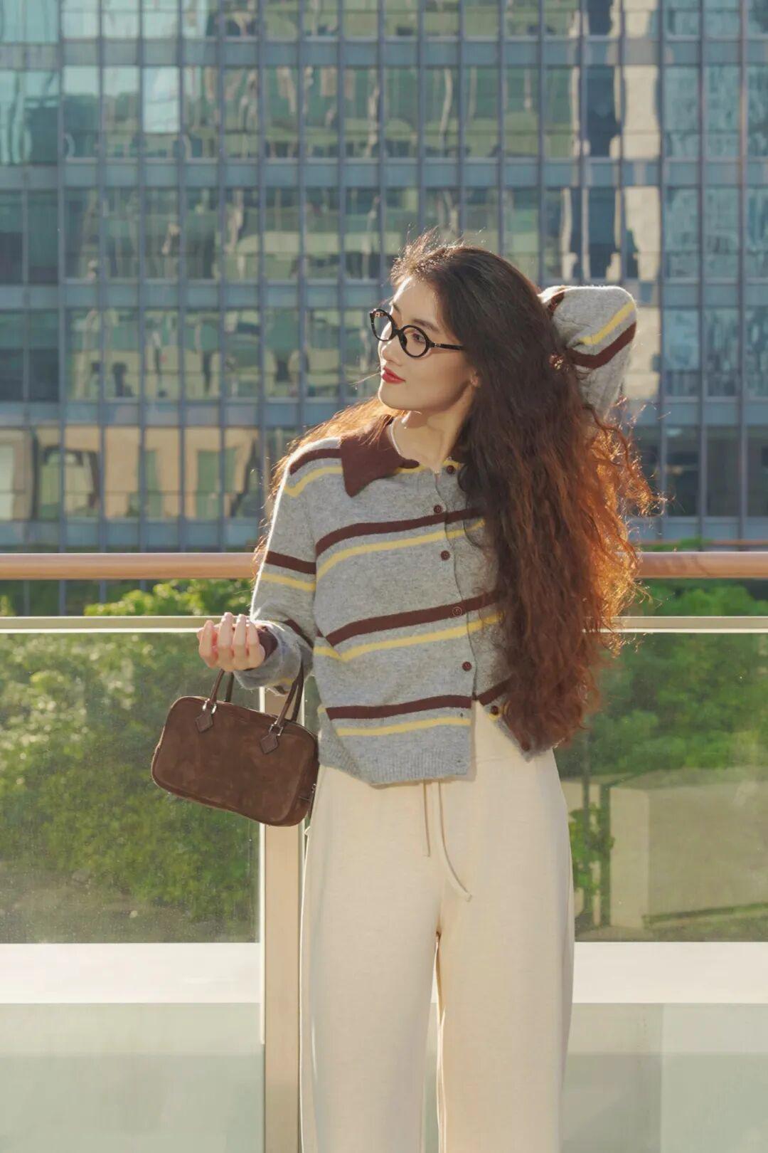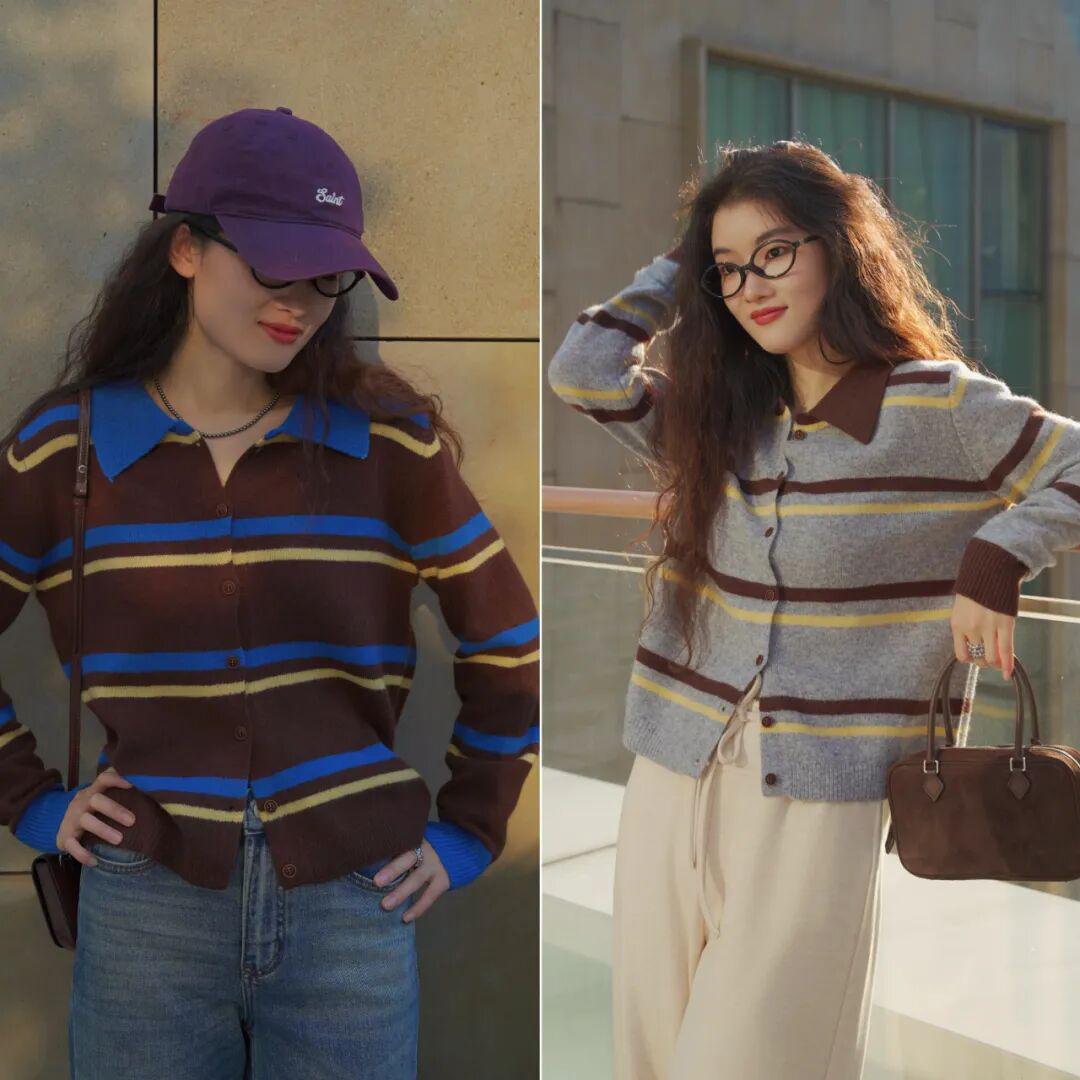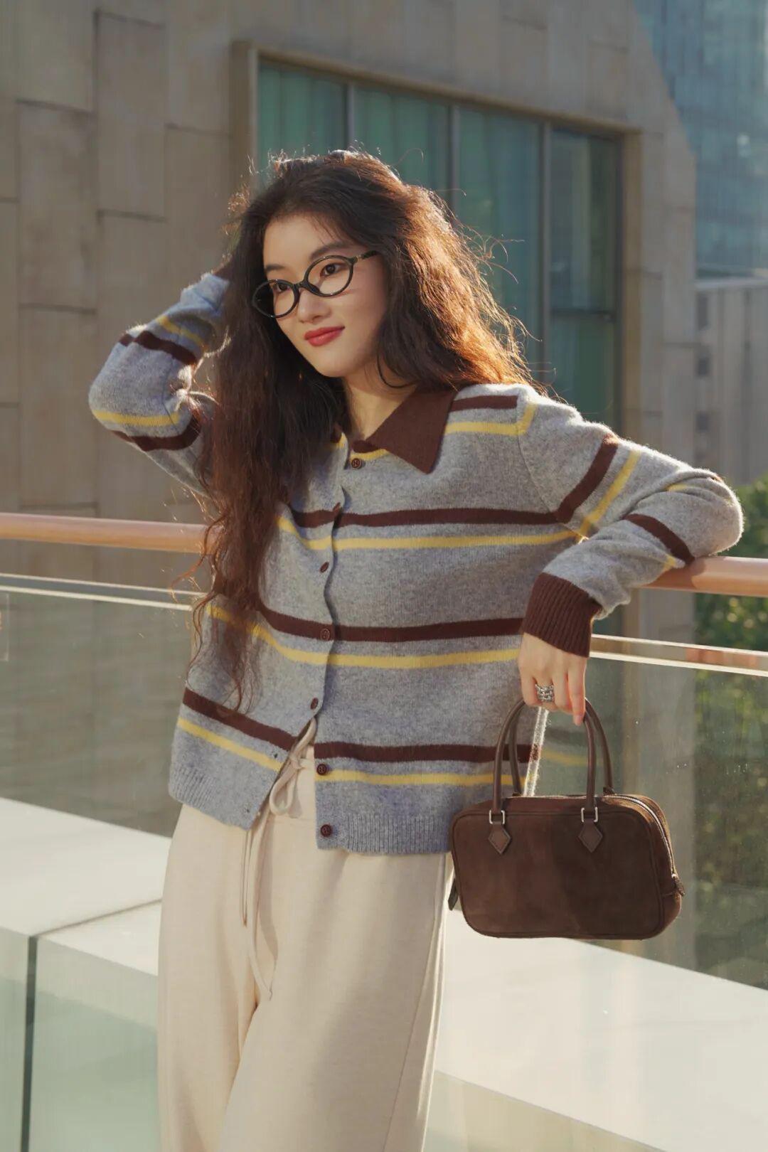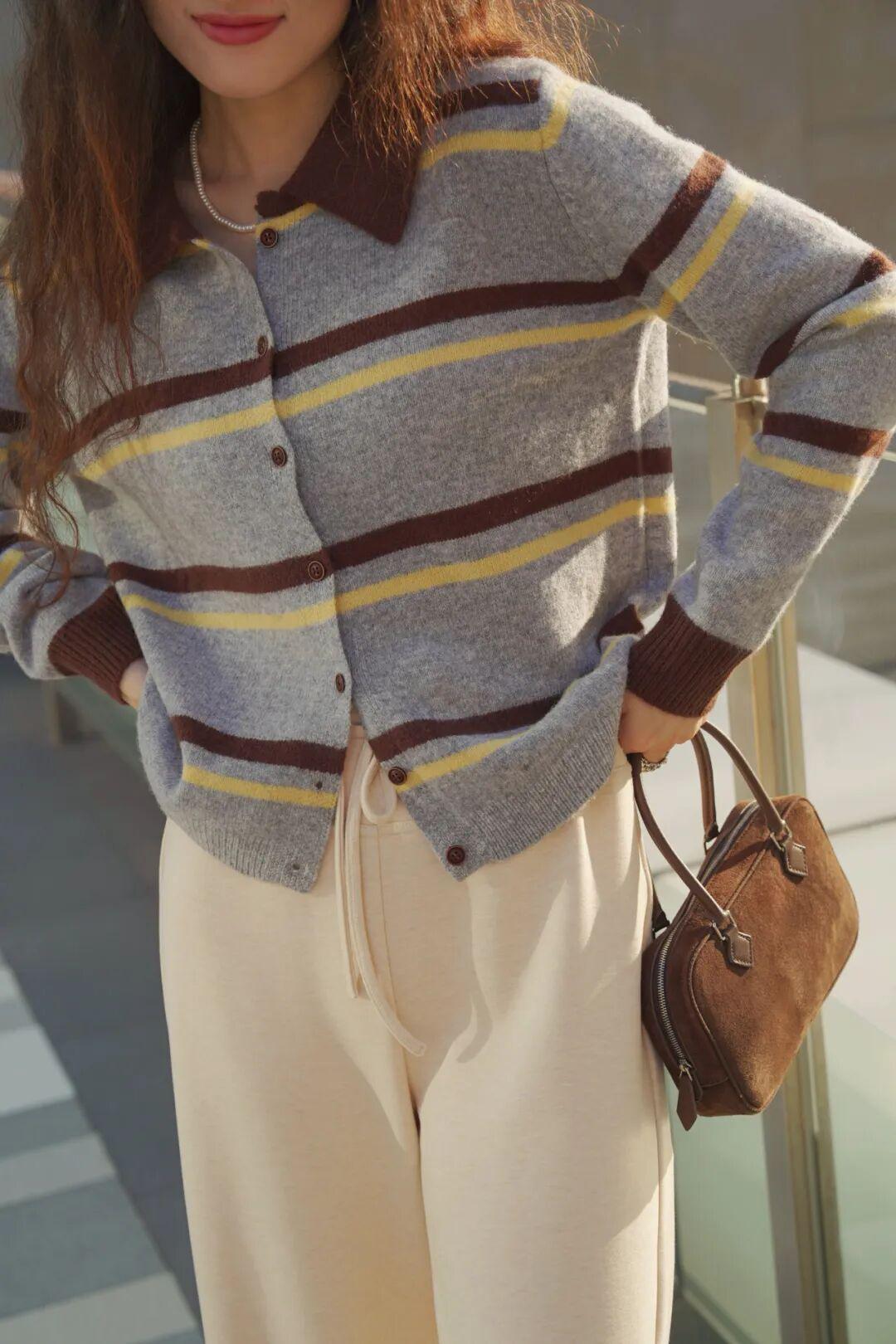 灰棕黄条纹自带一种朦胧美感,不挑肤色,小面积的黄色&咖啡棕,很别致地把秋意糅合到衣服里,配浅色的下装有种复古文艺的氛围。 ▼