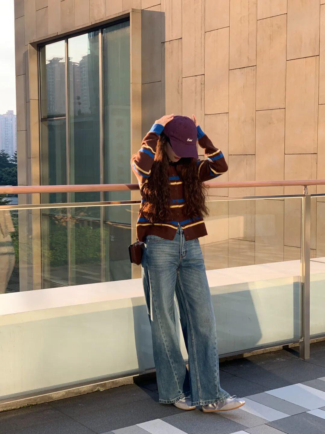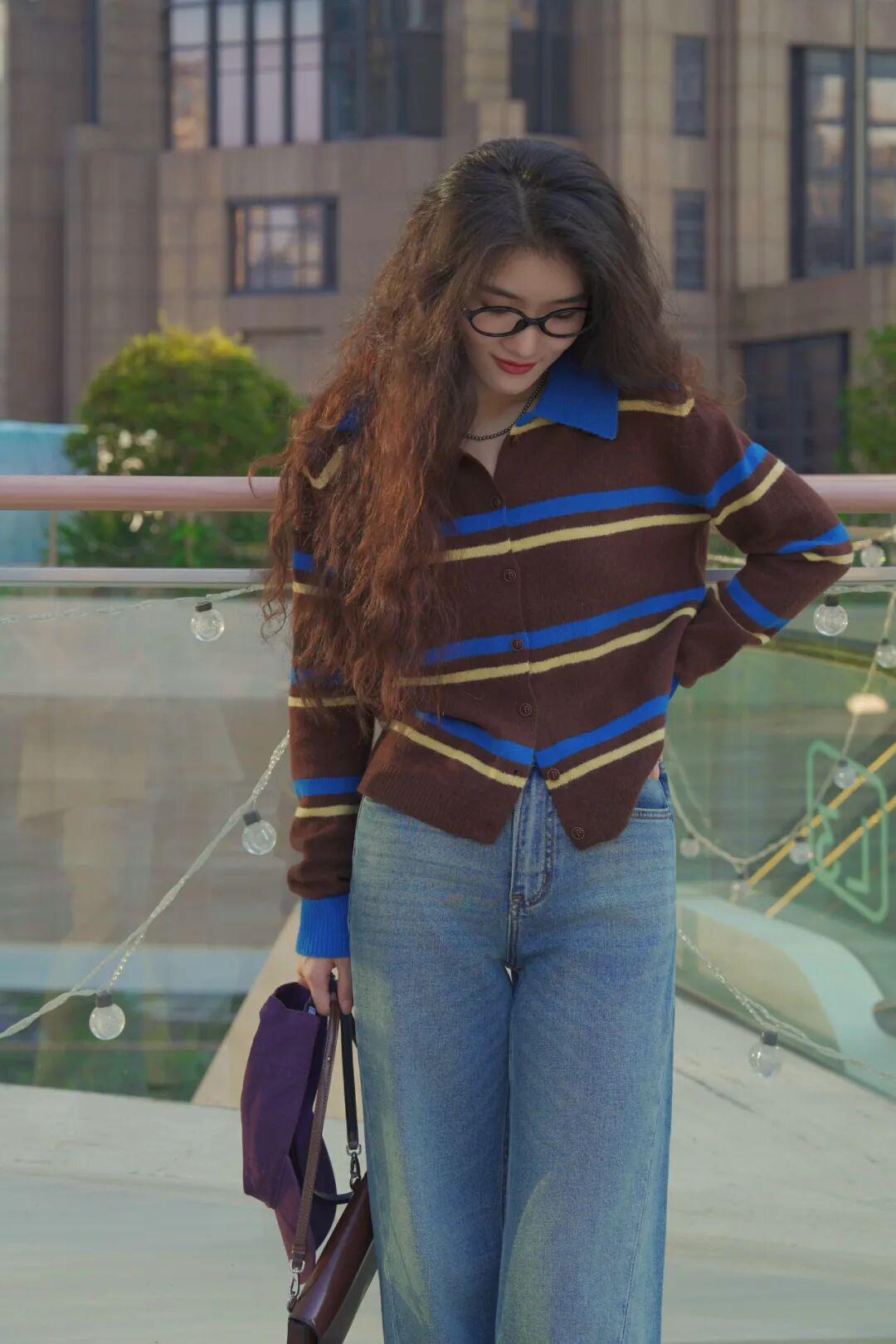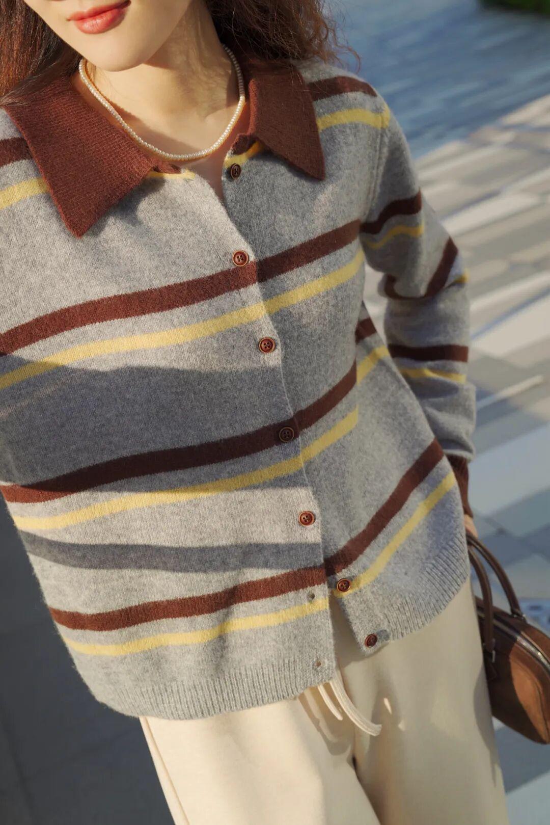 灰棕黄条纹自带一种朦胧美感,不挑肤色,小面积的黄色&咖啡棕,很别致地把秋意糅合到衣服里,配浅色的下装有种复古文艺的氛围。 ▼