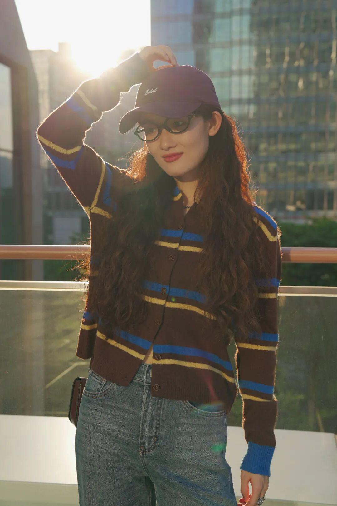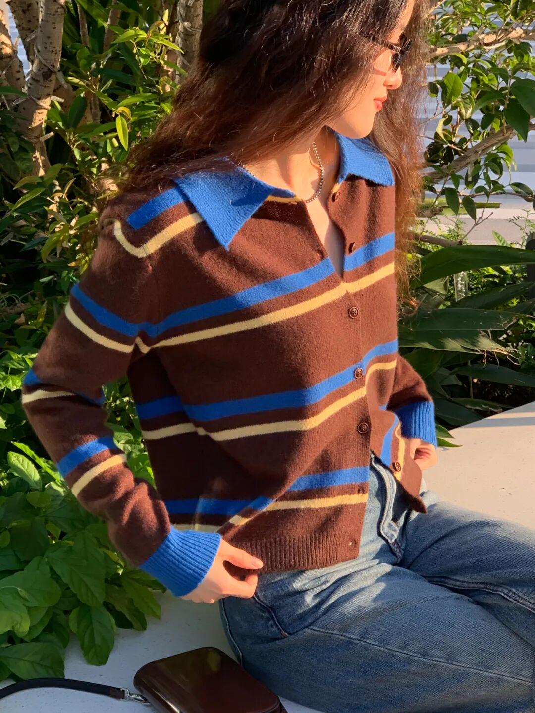 棕蓝黄条纹,颜色看似浓郁但一点也不沉闷。告诉你们哦,这个蓝色我们对比过色卡,选的是超显白的藏蓝调!日常配一条简单的牛仔裤都很出众了。