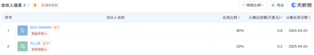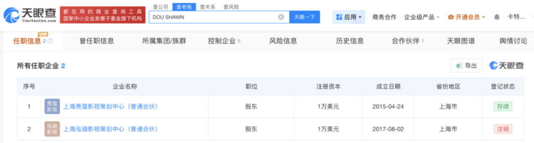 上海蔸蔻影视策划中心(普通合伙)由马某洁担任执行事务合伙人,窦骁(DOU SHAWN)为受益所有人,持股比例为80%。