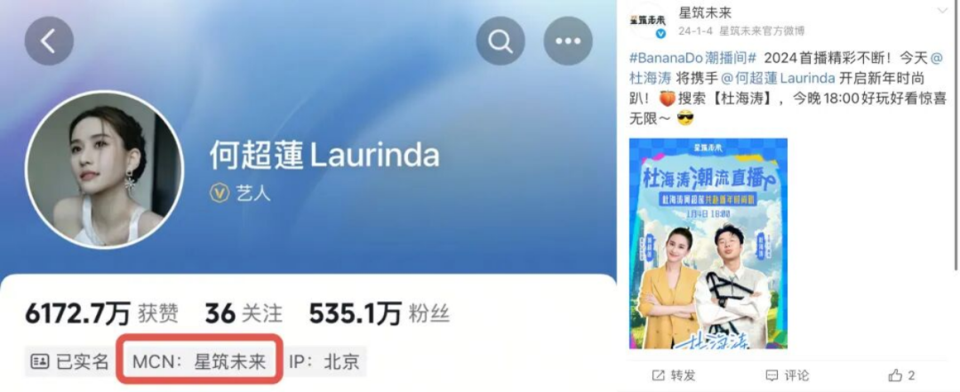 目前,何超莲抖音有535万粉丝,并签约了 MCN公司星筑未来。星筑未来关联公司为北京星筑未来科技有限公司。