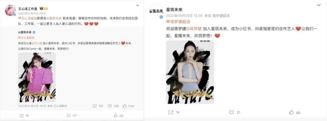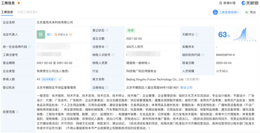 天眼查显示,该公司成立于2021年,由星筑未来(北京)控股有限公司全资控股。该公司旗下的艺人还有王心凌、蒋梦婕等。