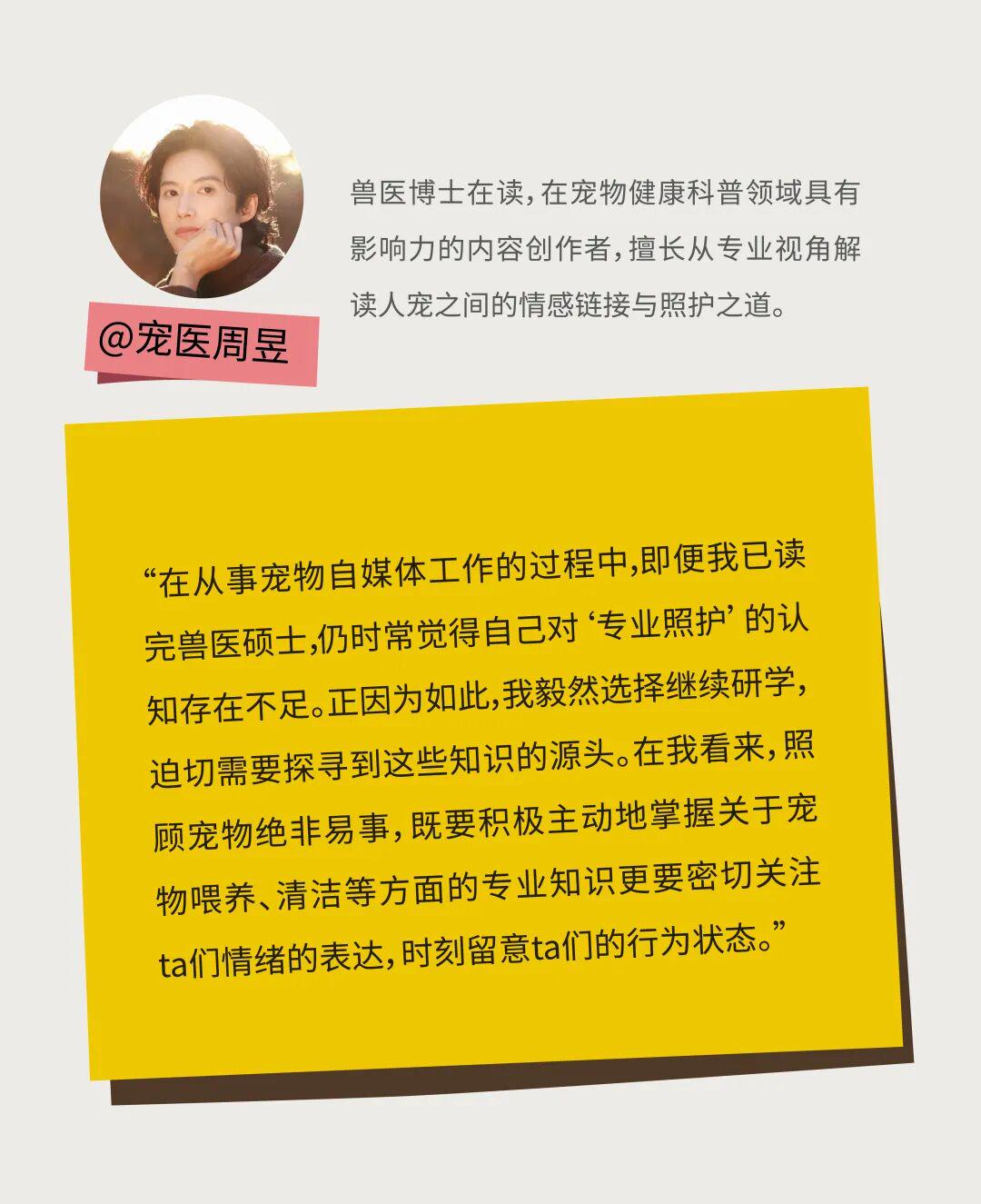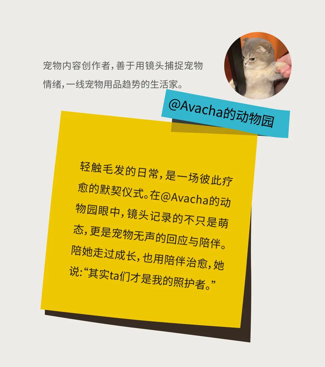 @宠医周昱坚持:"应该在主动学习更多健康知识的同时,尊重宠物的动物性,不强迫、不主导ta们。”Avacha的动物园在创作内容的同时会思考:作为拍摄者,我曾经希望有更好的角度展示宠物但是在我做博主职业以后,我还是发现,一个视频真正打动人的并不是完美的角度,而是通过视频展示宠物与主人双向流动的爱。
