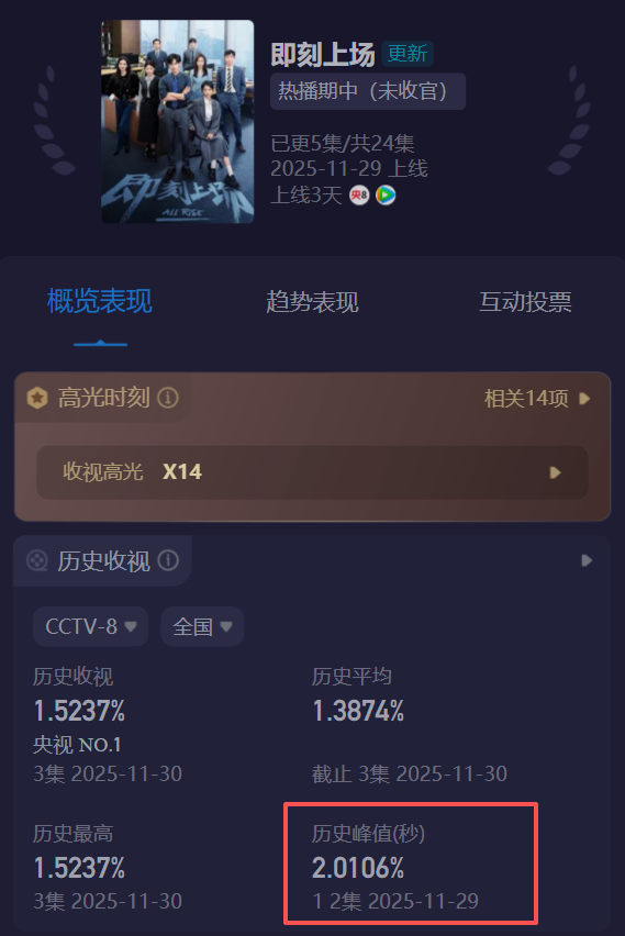 收视率稳居后黄金档第一名,最高收视峰值破2,没有丢掉央视大剧的排面。