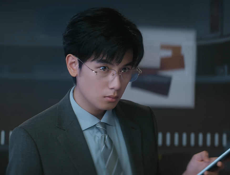 胡先煦饰演的江晨出场,一身西装背着双肩包,戴着一副金丝边眼镜,气质成熟、稳重,充满高智感。