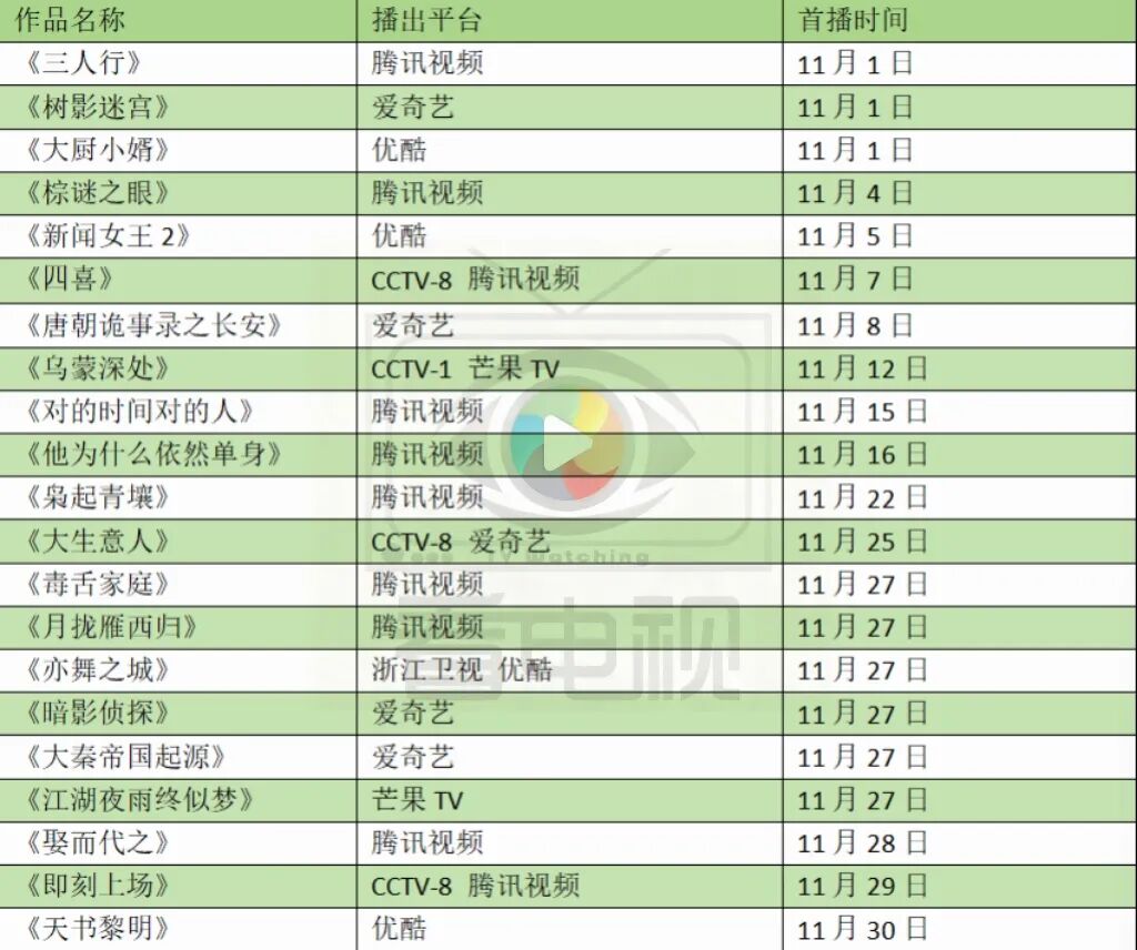 11月剧集探索多元化之路,现代剧和古装剧以差异化视角和笔触展现自身价值表达。据“看电视”的不完全统计,11月共上新21部。