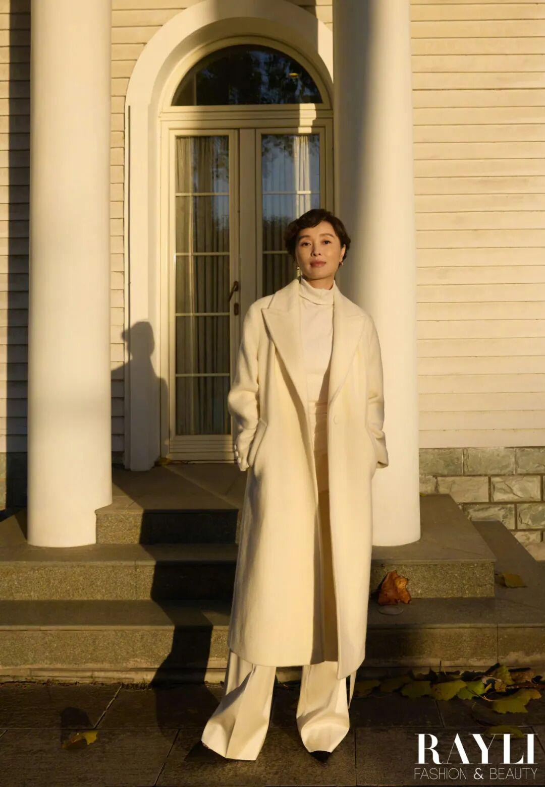 白色高领衫、白色阔腿裤、白色风衣/均为 YI,
