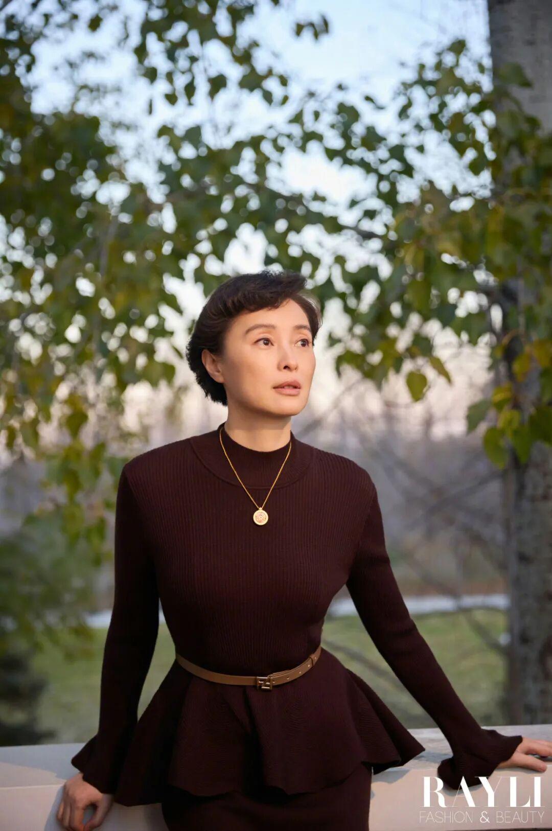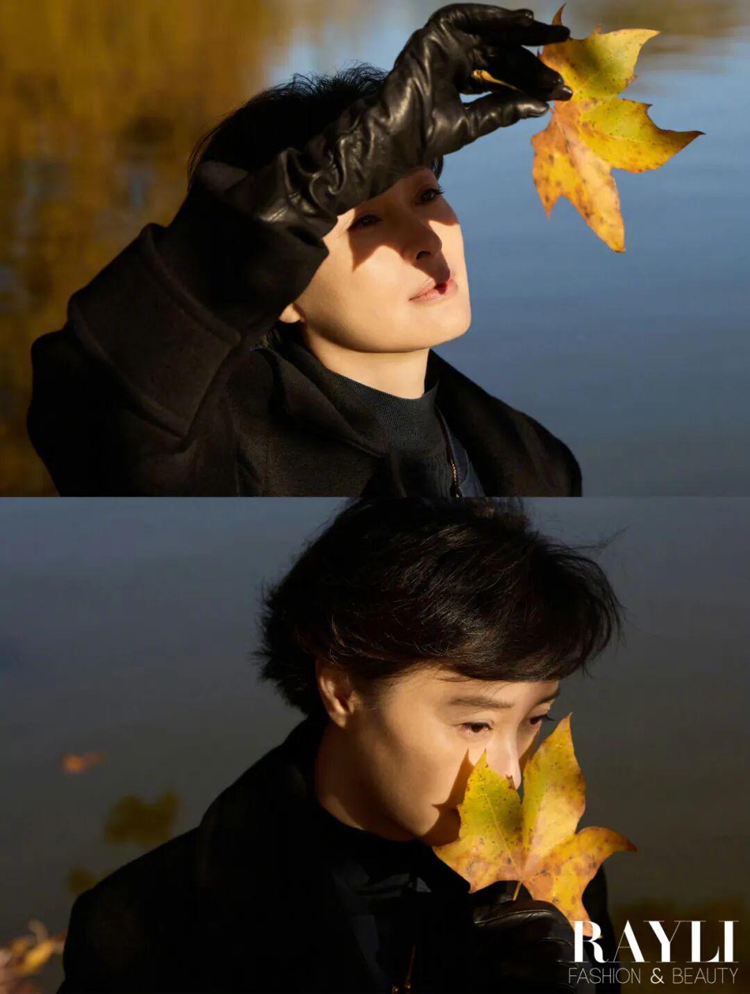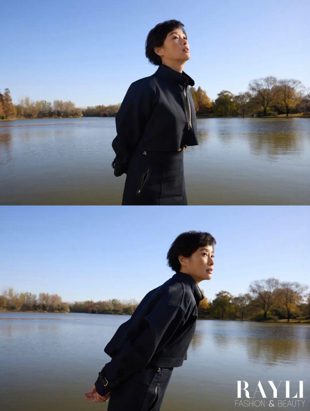 在我们的湖边拍摄现场,制片跟她解释说先别穿大衣拍,省得穿了脱掉体感更冷。她笑道:“没事,我们演员都是扛冻的。”拍完盯着显示屏说“最好选特别自然的”,再看了看照片表示:“有动感,就好看。”