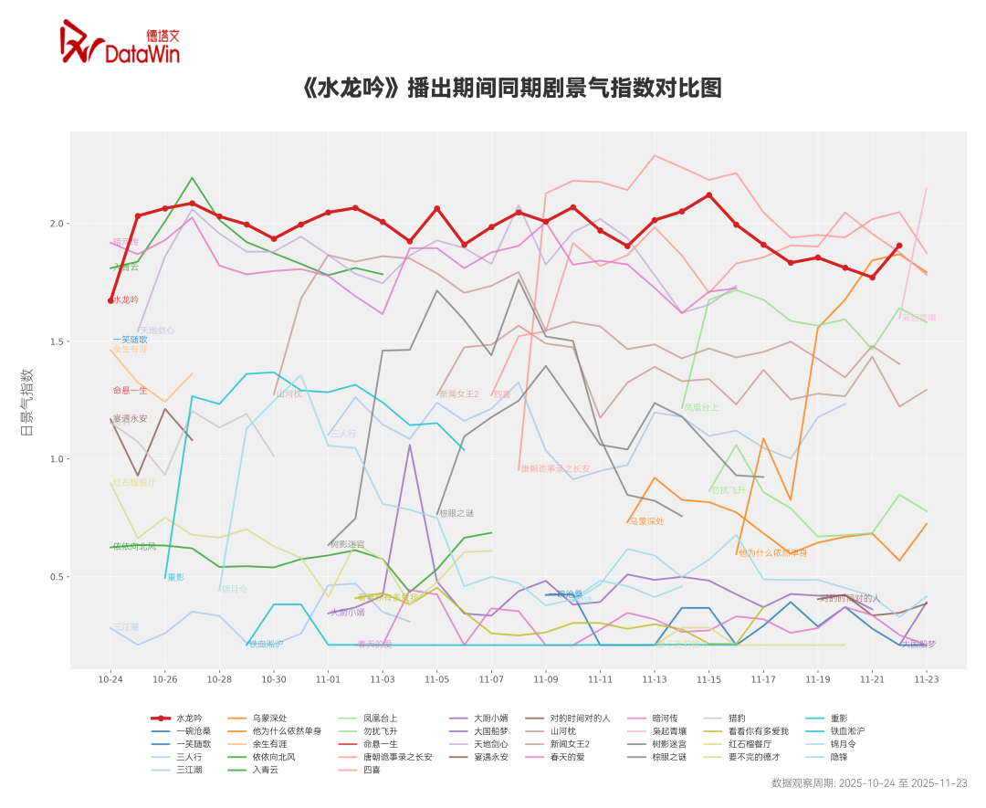 临近收官,热度平缓回落,但仍维持在1.800以上水平。值得注意的是,VIP收官(11月21日)后热度不降反升,于11月22日回升至1.907,表明大结局引发了观众的持续讨论与关注,尤其是关于“开放式结局”和“主角命运”的探讨。