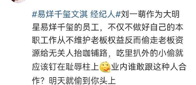 这两天易烊千玺粉丝一直在骂他经纪人,同时发声让团队换经纪人,因其挪用资源给文淇,不顾易烊千玺的发展(易烊千玺合约到期的几个品牌,今年由文淇接替同头衔代言),女方主演的电影也被指出与易烊千玺主演的电影制作团队核心重合。粉丝的意思是经纪人能力不行,还把主要心思放在文淇身上,利用易烊千玺自身资源去捧其他艺人。