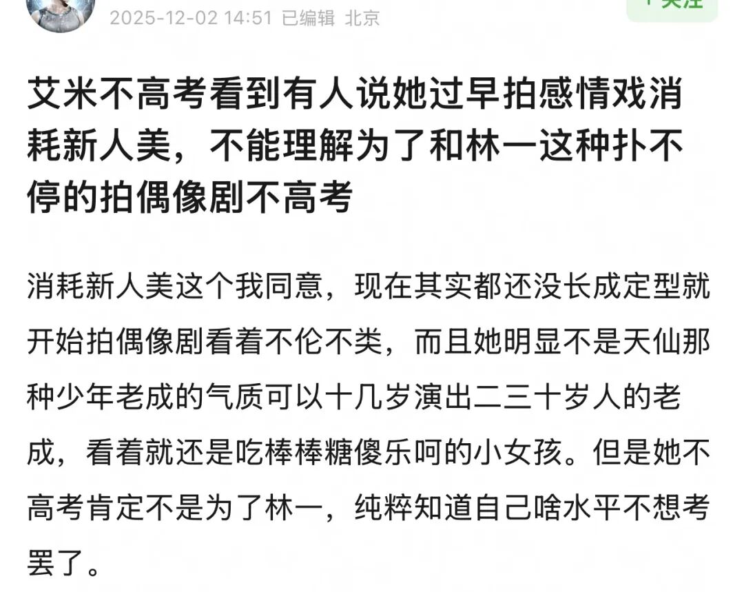 不少粉丝吐槽她和林一合作的新剧根本不是值得放弃统考的正剧大饼,还担心平台买股热度转瞬即逝,没有科班人脉和学历,后续很容易被行业抛弃。