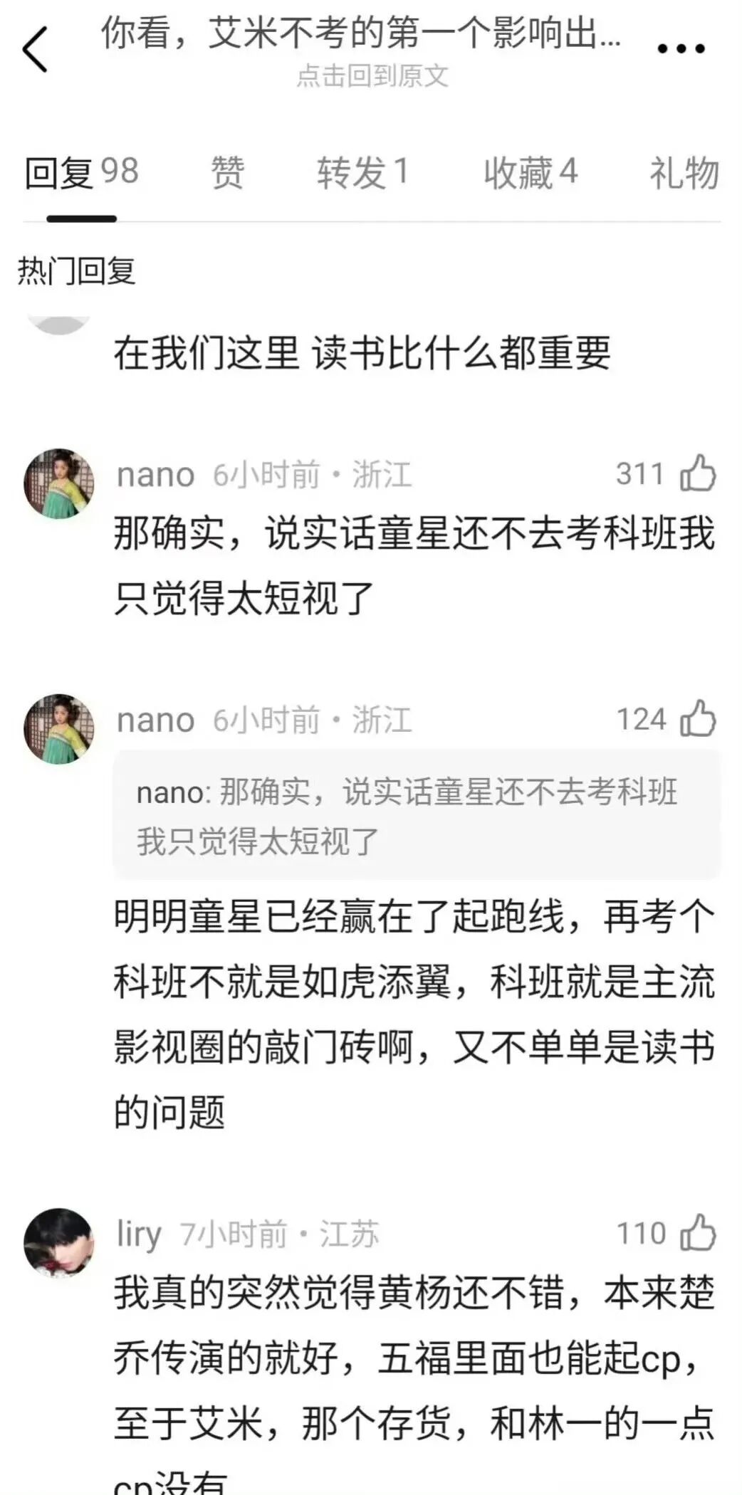 对童星...当然也没有例外,张子枫高考那阵,全网蹲考场路透,成绩一出不管是艺考名次还是文化课分数,都被拿出来反复讨论,招生办都得出来澄清谣言。