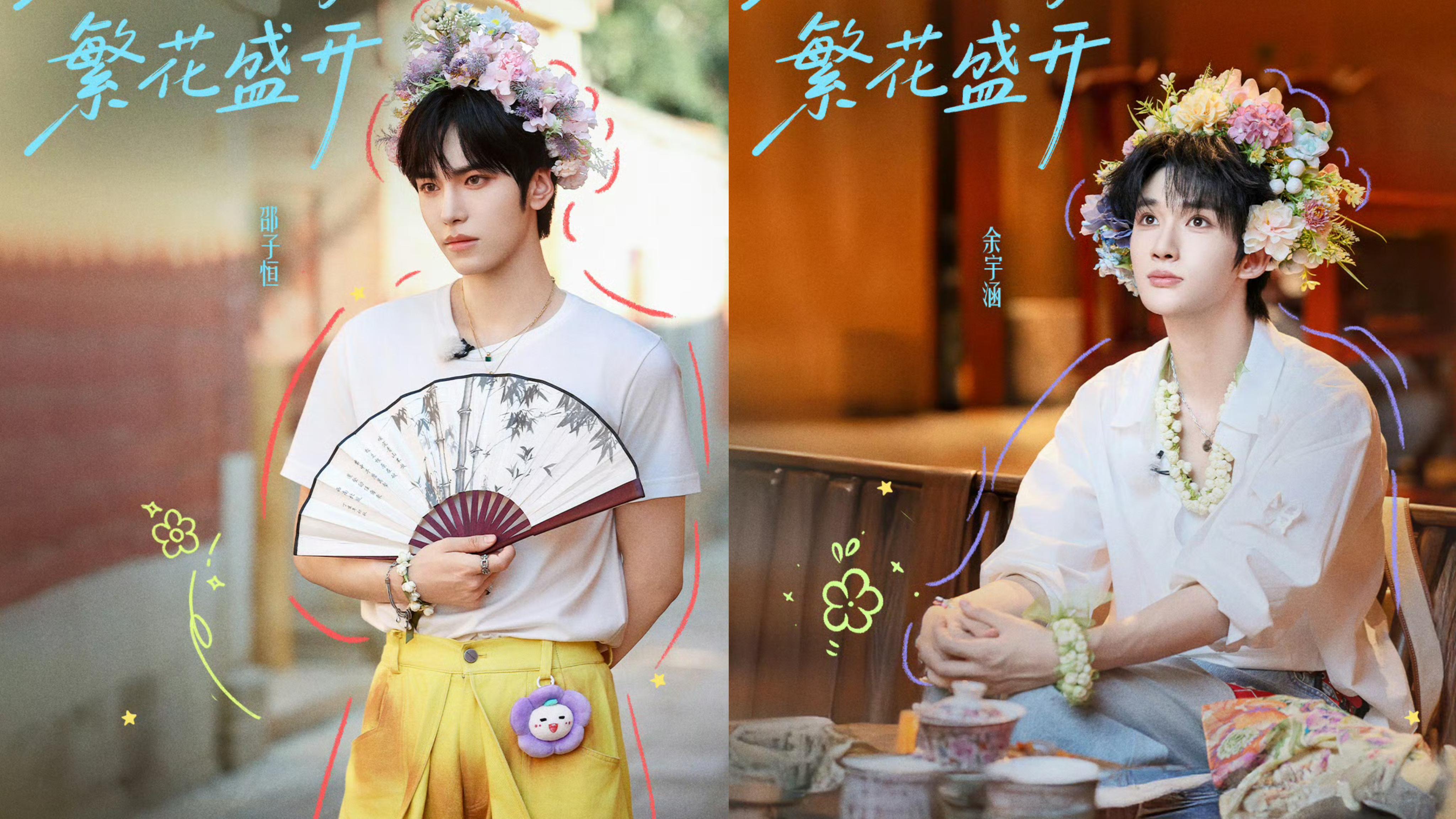 邵子恒和余宇涵都有练习生经历,所以一见如故。因为本集有簪花的环节,所以大家都穿亮色。