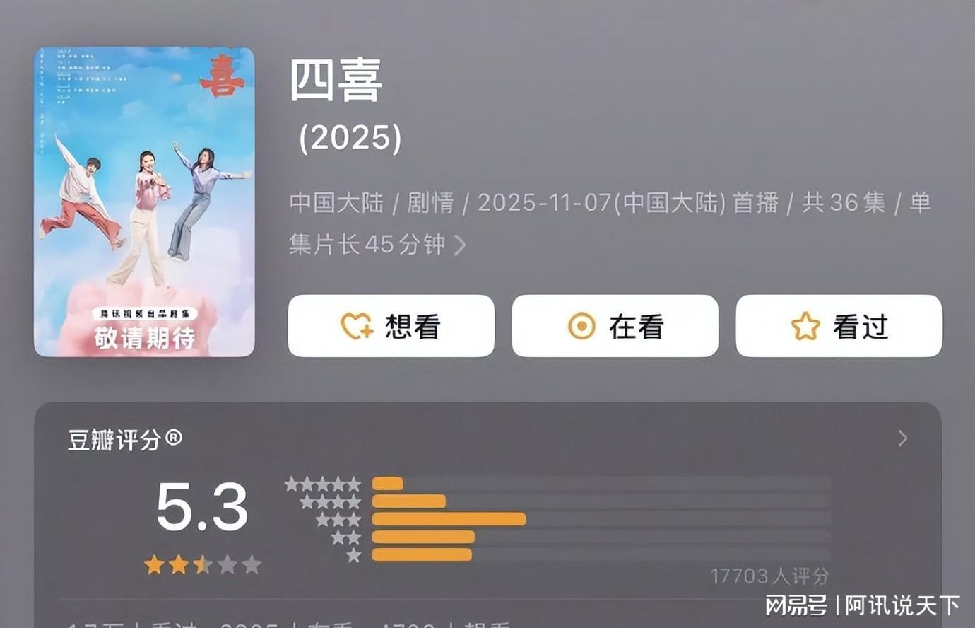 《四喜》的开分情况最为复杂。豆瓣开分5.3分,开播后“差评如潮”,一万七的人数,好评五星跟差评一星数据直接颠倒,五星只有6.7%,四星16%,三星33.4%,二星22.3%,一星21.6%