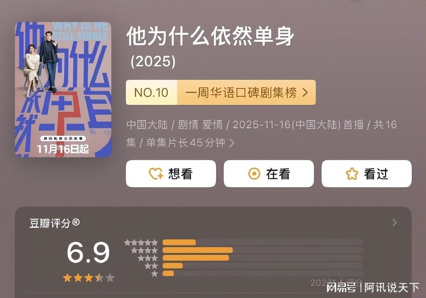 《他为什么依然单身》豆瓣6.9分的成绩在国产都市剧中堪称亮眼。该剧的市占率更是一度冲到9.1%。