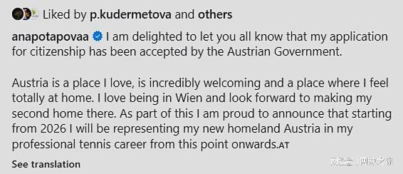 最后,波塔波娃还真的宣布将自己的原俄罗斯国籍给换了,不过不是奥地利,而是维也纳,“我很高兴地告诉大家,我的奥地利公民身份申请已被奥地利政府批准。奥地利是我深爱的地方,这里热情好客,让我感到宾至如归。我热爱维也纳,并期待着在那里安家落户。同时,我荣幸地宣布,从2026年起,我将代表我的新祖国奥地利参加我的职业网球比赛。”