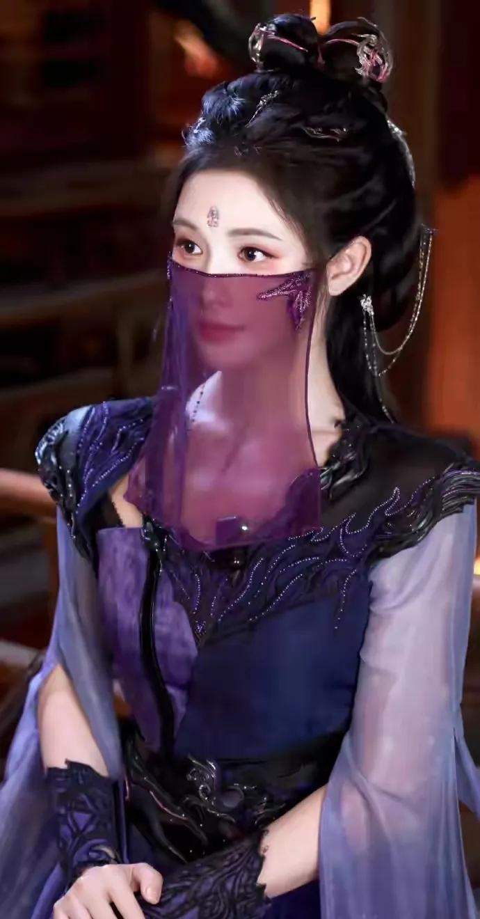 前不久在《暗河传》扮演暗河第一美女慕雨墨,紫色造型与冷艳气质结合,武打戏份干净利落,眼神戏层次丰富,霸气御姐的娇媚和清冷融合得刚好。银发蓝瞳造型美出新高度,面纱和面具增加神秘感,大红大紫的色调和她绝配。