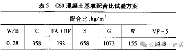 依据现行行业标准《普通混凝土配合比设计》确定C60基准配合比见表5
