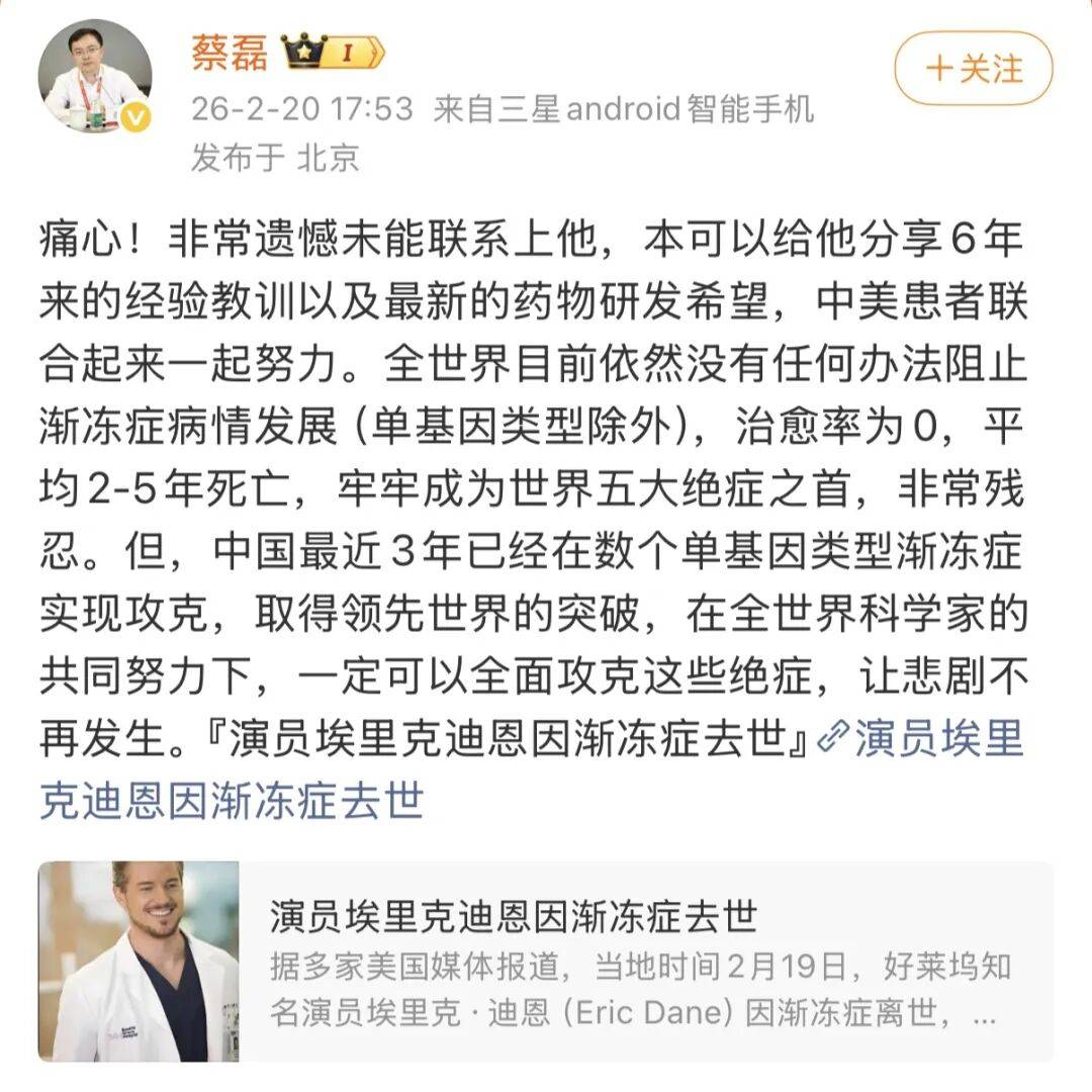 20日下午,蔡磊发声表示痛心,表示非常遗憾未能联系上他,本可以给他分享6年来的经验教训以及最新的药物研发希望,中美患者联合起来一起努力。