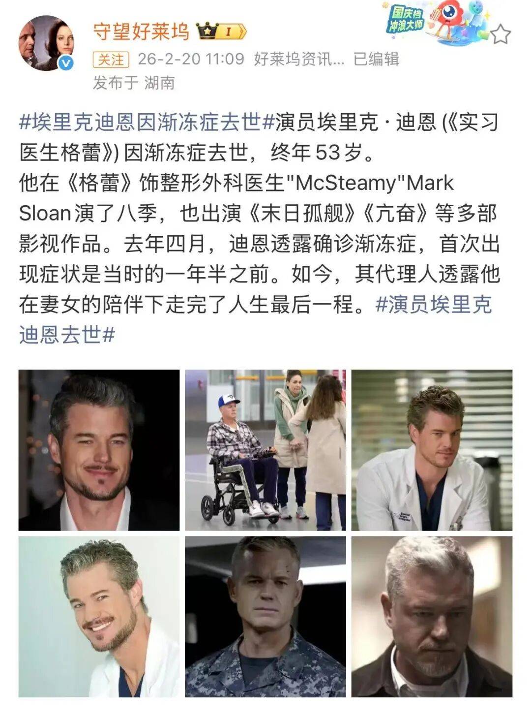 据好莱坞资讯发布官方微博@守望好莱坞 消息,出演过《亢奋》《实习医生格蕾》等剧集的美国男演员埃里克·迪恩(Eric Dane)于本周四(19日)去世,享年53岁,该演员此前一直与渐冻症抗争。20日下午,渐冻症患者、京东前副总裁蔡磊发声表示痛心。