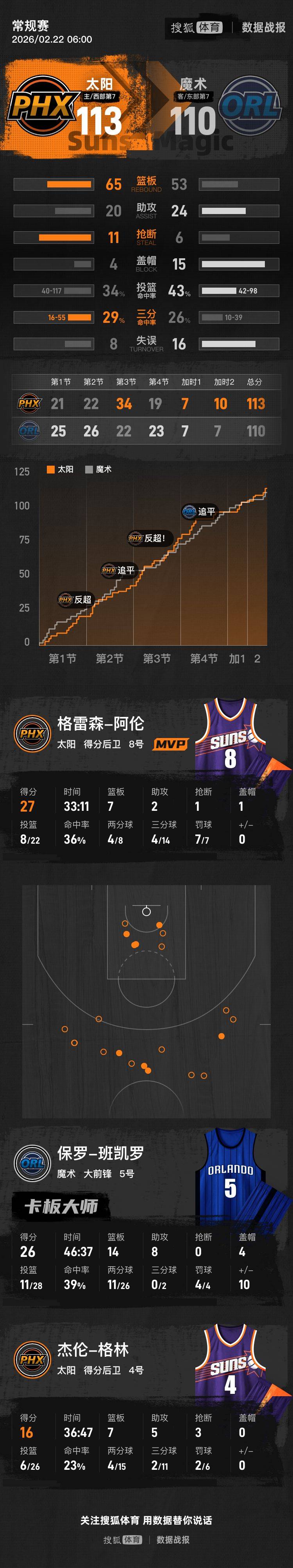 【搜狐体育战报】北京时间2月22日NBA常规赛,主场作战的太阳以113-110双加时击败魔术。伊戈达罗11分12篮板1助攻,班凯罗26分14篮板8助攻。