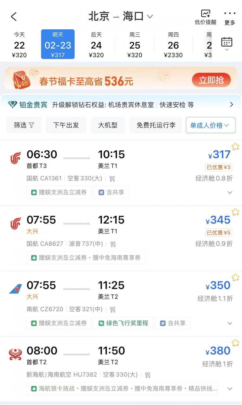 其中,2月23日(初七),北京飞海口、三亚,惊现大量1折经济舱机票,售价最低345元,进出海南岛机票价格差超10倍。
