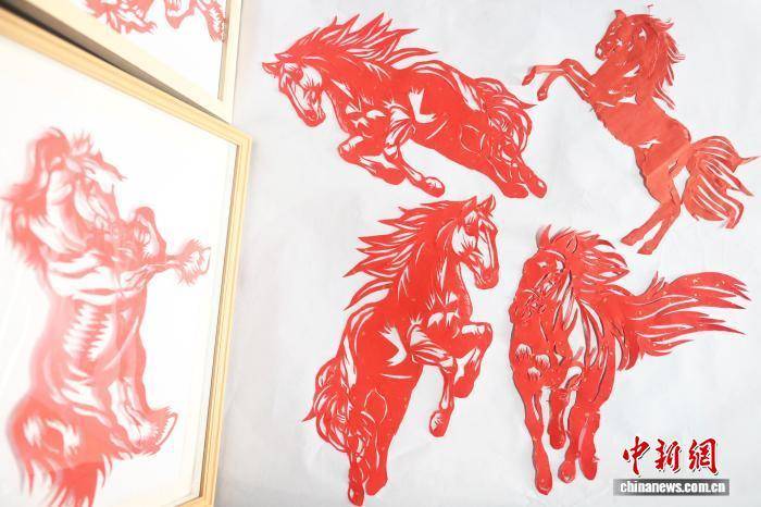 资料图:在位于甘肃省兰州市一剪纸工作室内,展示的甘肃剪纸艺人张旭创作的马年剪纸作品。中新社记者 李亚龙 摄