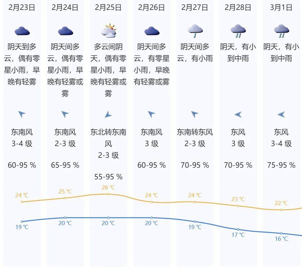 2月23日(大年初七),阴天间多云,偶有零星小雨,早晚有轻雾或雾,偏东风3~4级,气温略降;