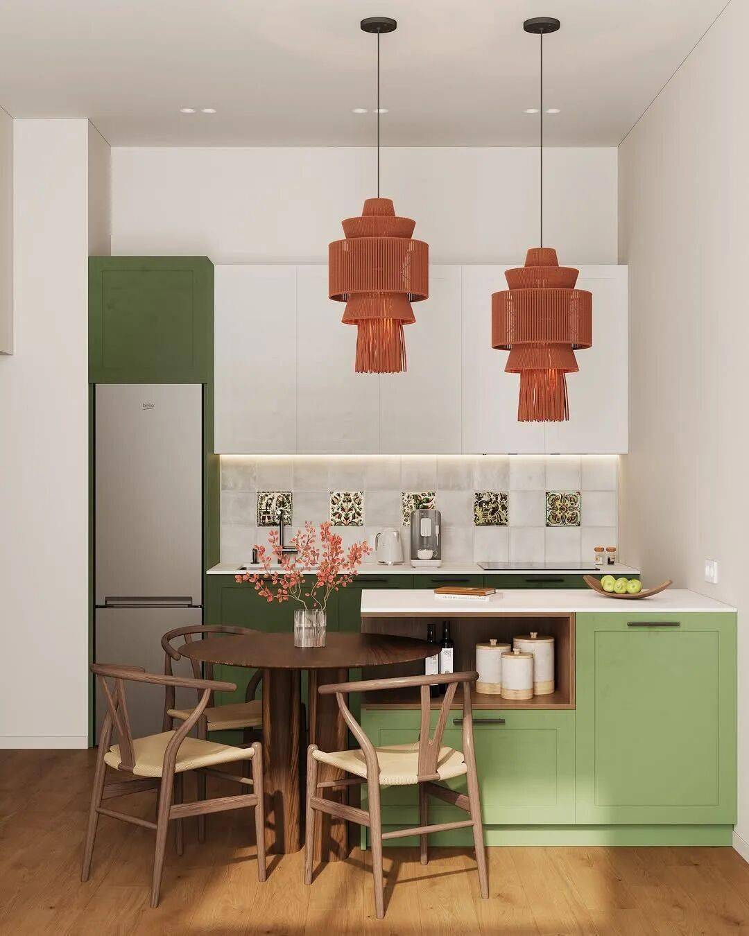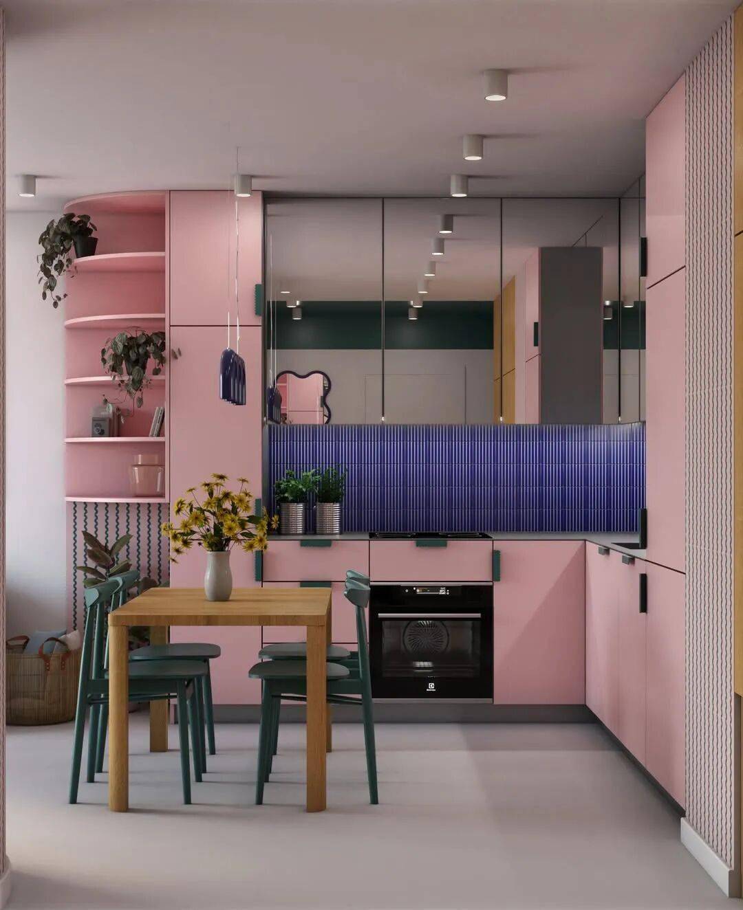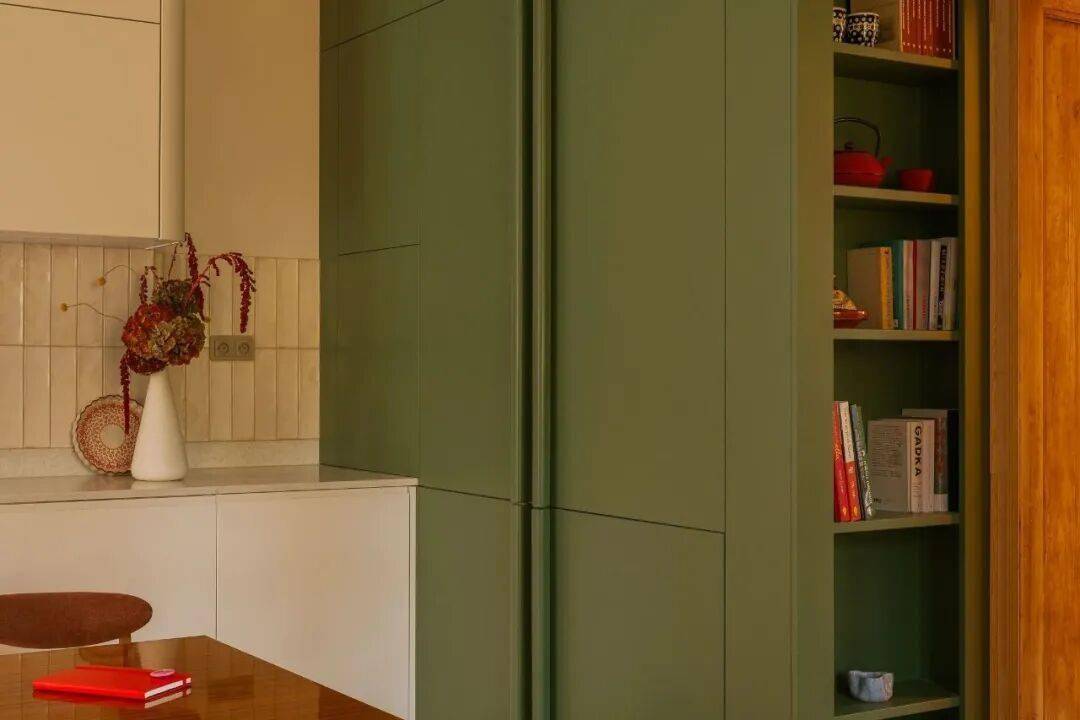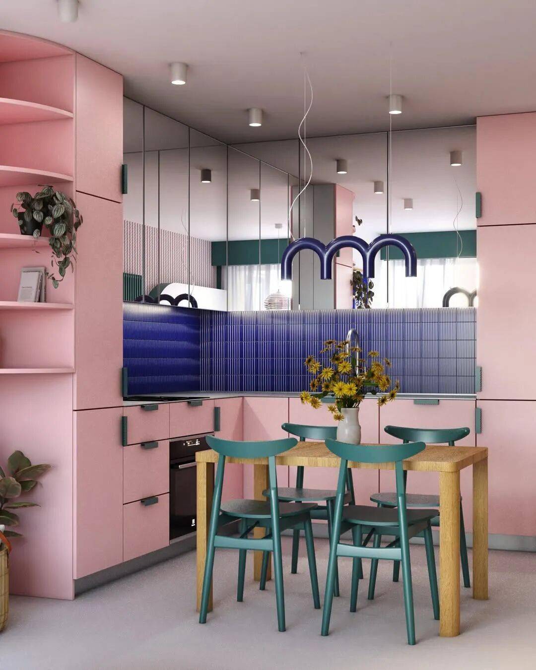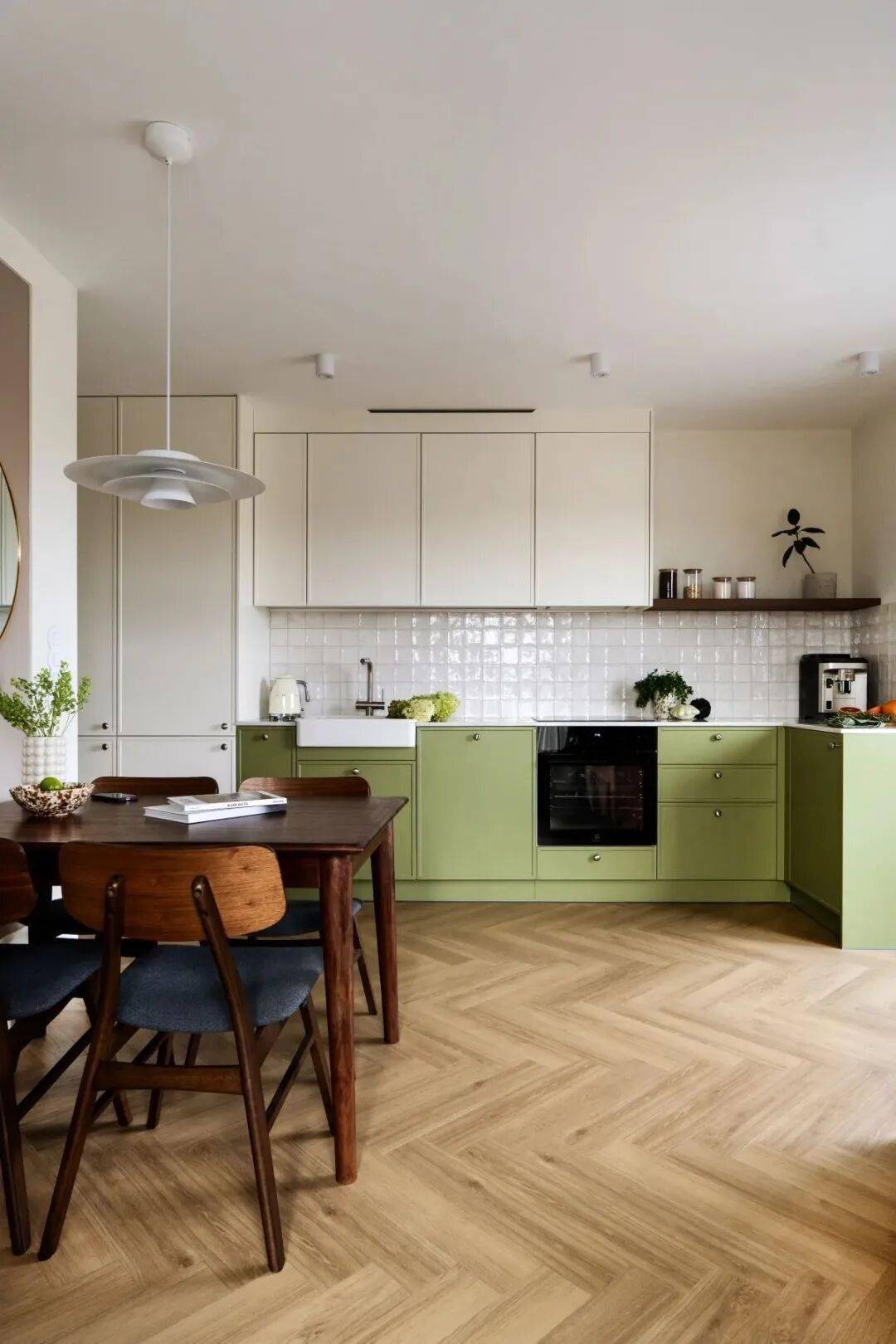 牛油果绿的餐区与同色系柜体呼应,营造松弛的治愈感;深棕木纹与粉色吊柜的撞色,则让空间跳出沉闷,鲜活又充满个性。