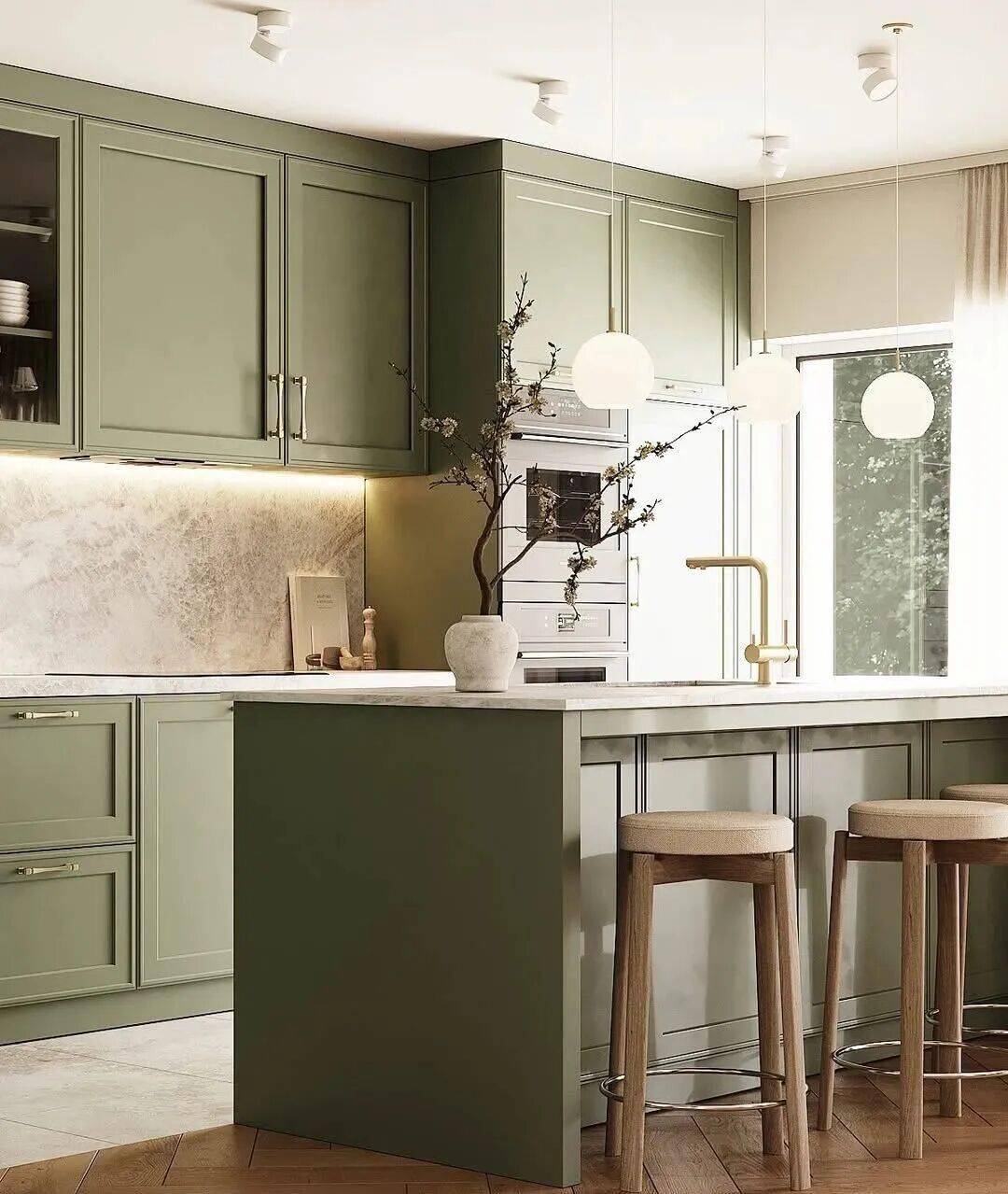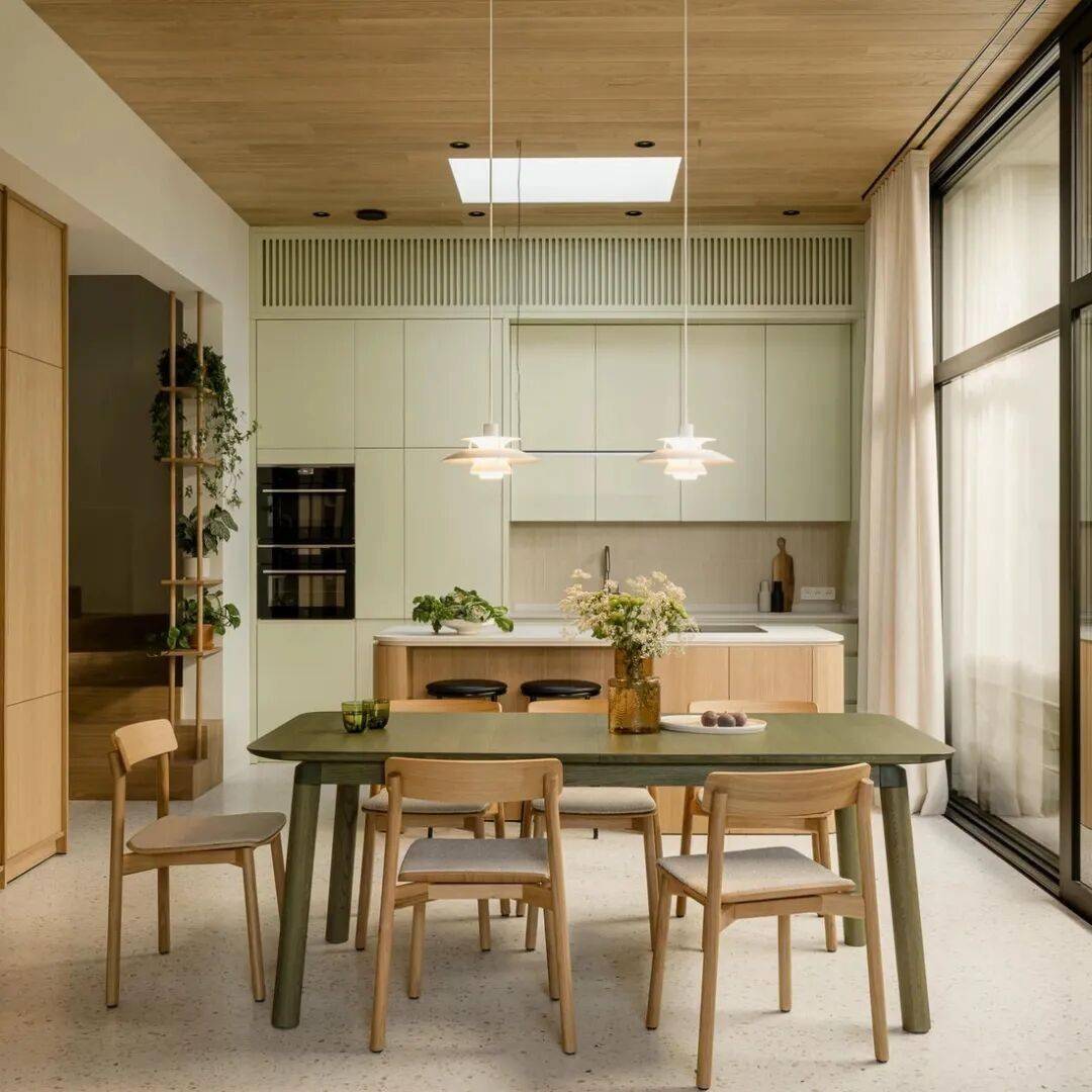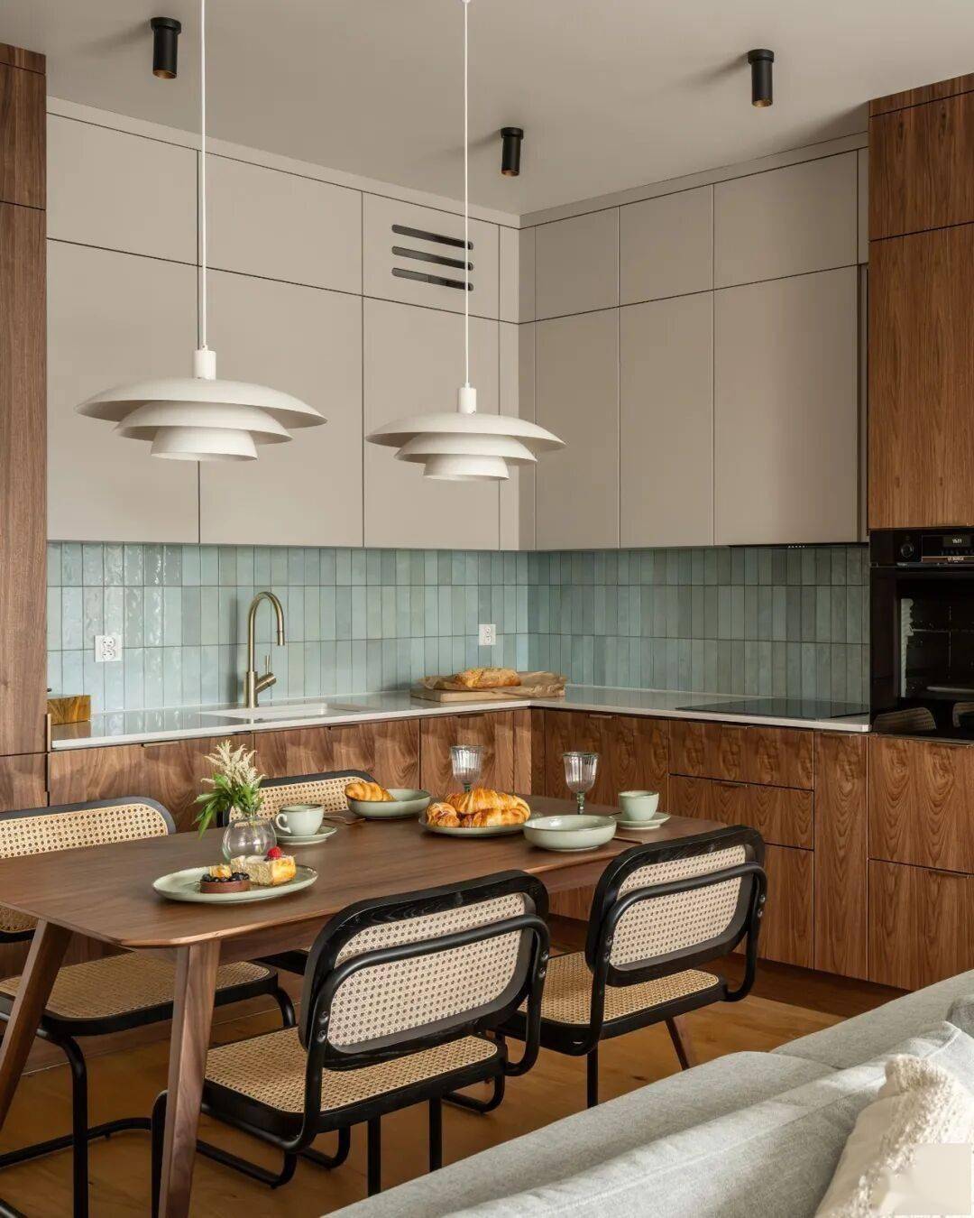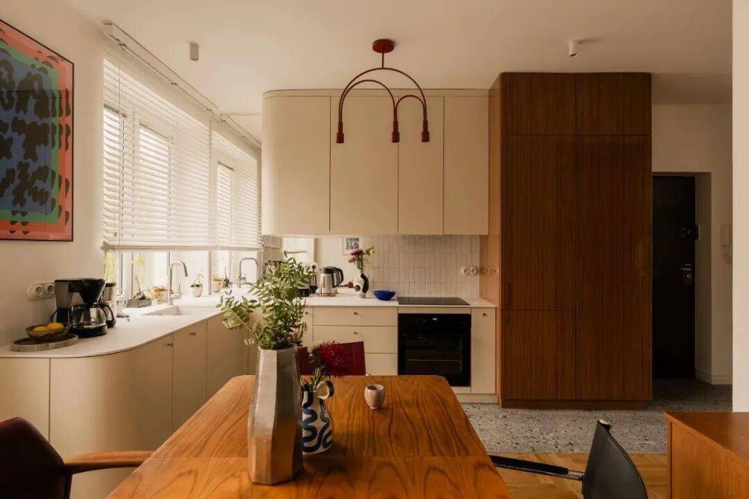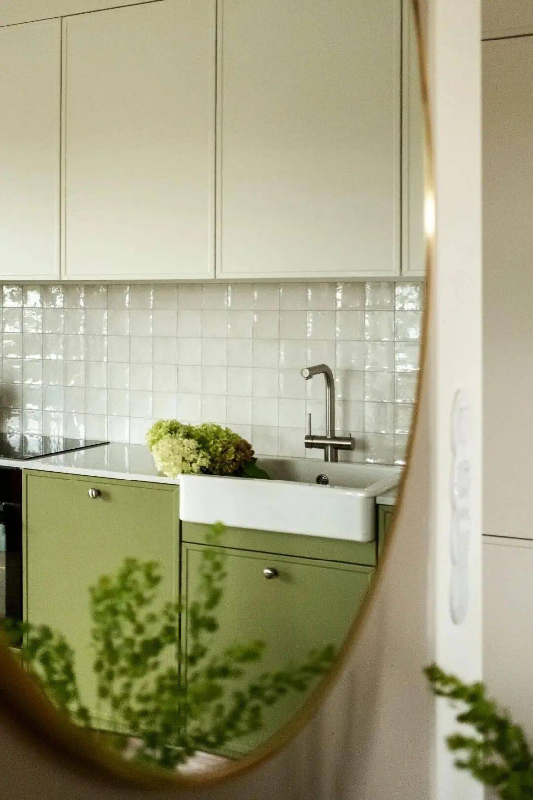 牛油果绿的餐区与同色系柜体呼应,营造松弛的治愈感;深棕木纹与粉色吊柜的撞色,则让空间跳出沉闷,鲜活又充满个性。