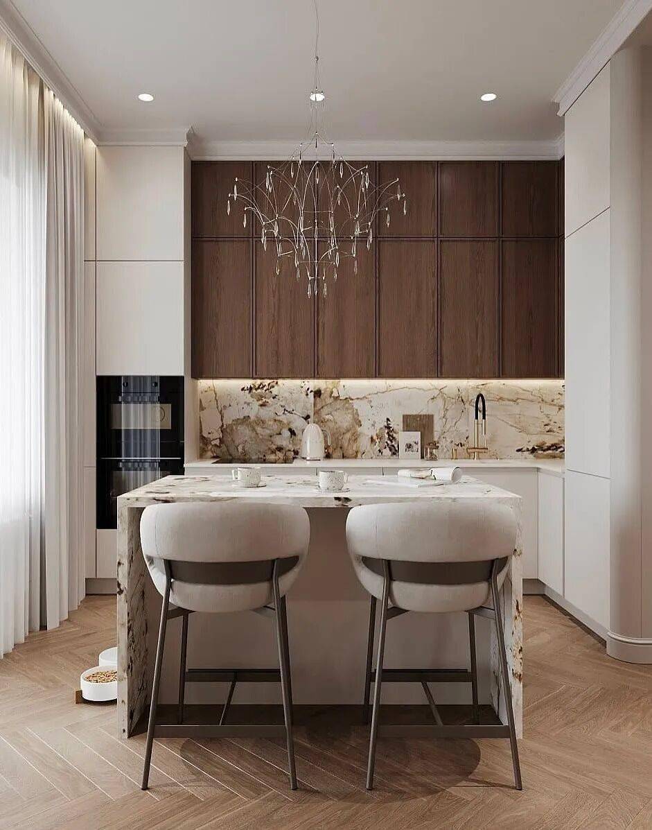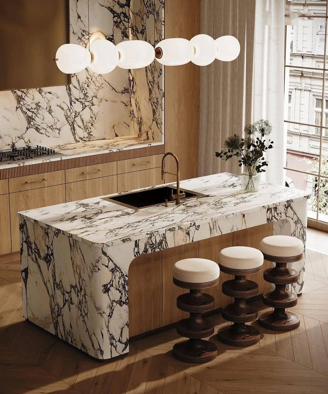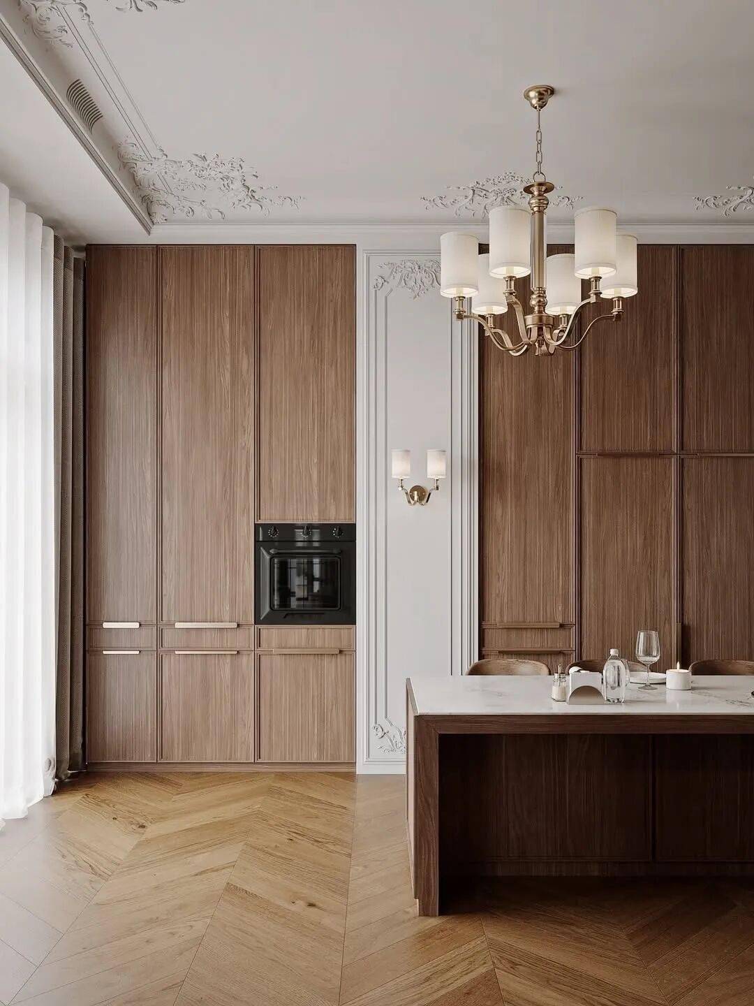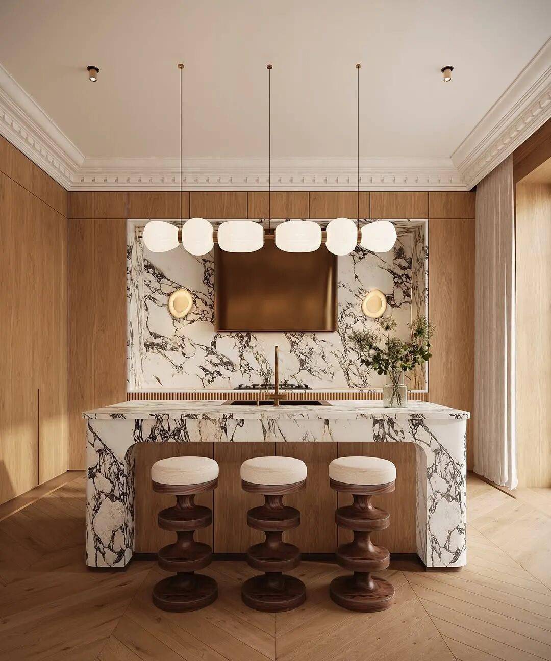 焦糖色金属砖搭配弧形奶油白柜体,柔化了空间棱角;而黑白根大理石岛台与木质护墙的碰撞,又在经典配色中演绎出现代轻奢的仪式感。