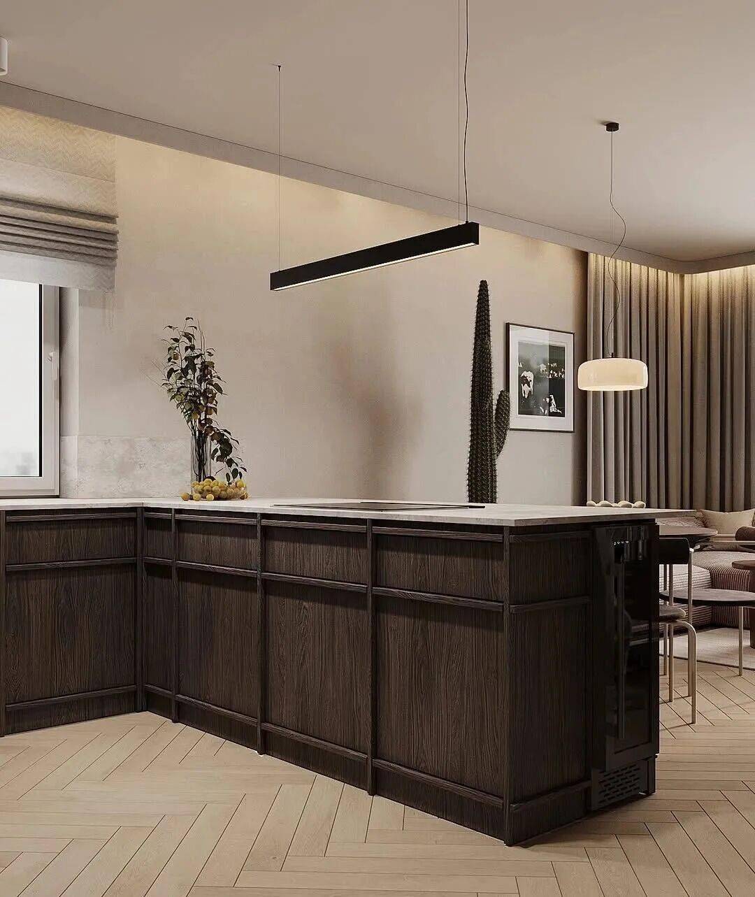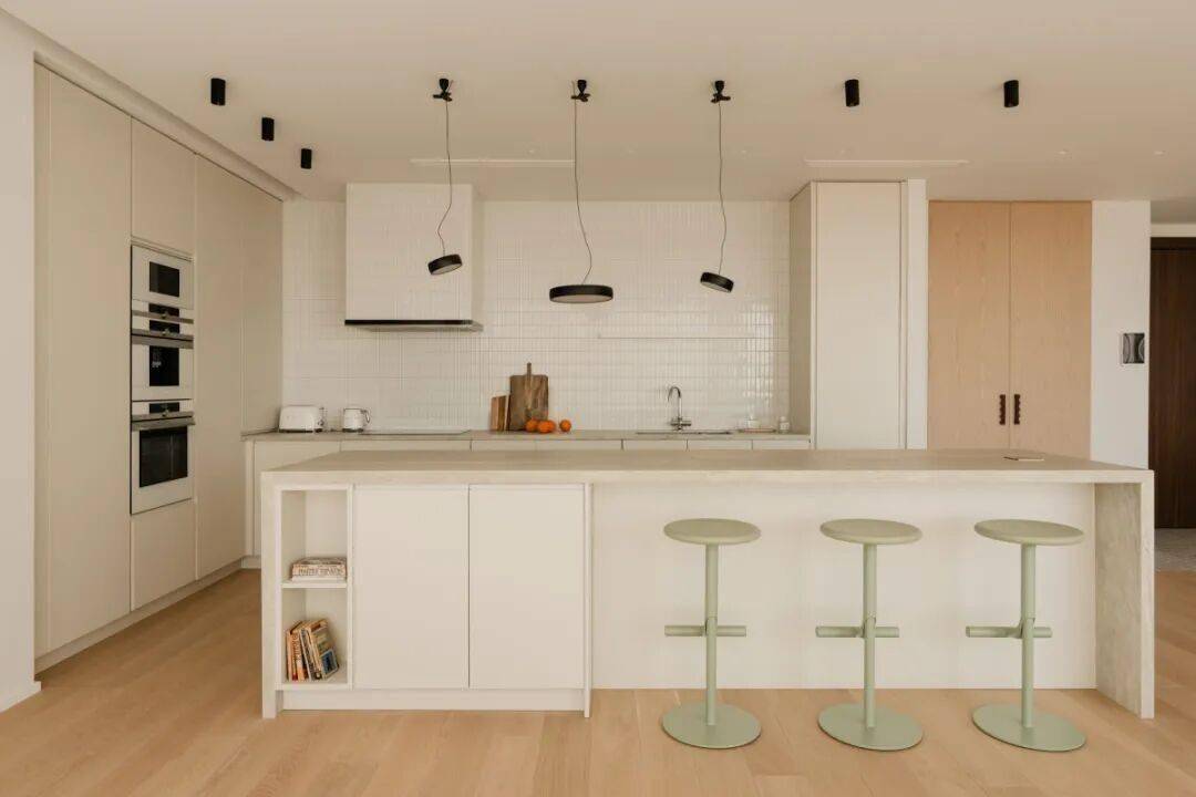 暖棕木饰面与纯白吊柜的组合,则以温润肌理中和冷调,让开放式厨房成为客餐厨互动的核心。