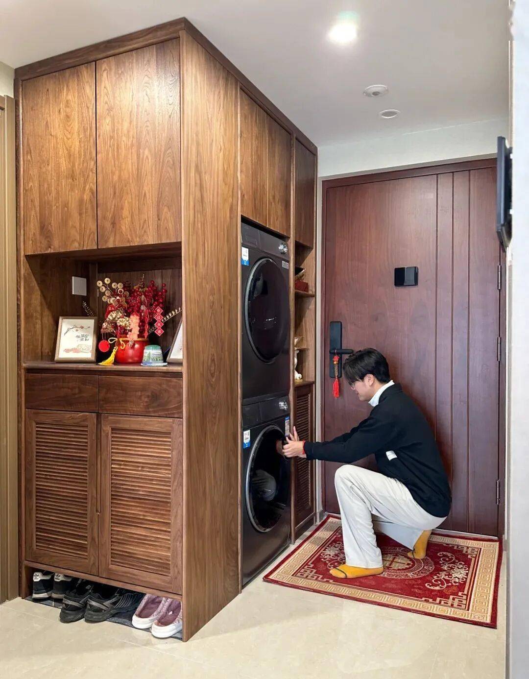 赵女士是最有创意的,她于玄关定制深柜,将洗衣烘干机藏了进去。